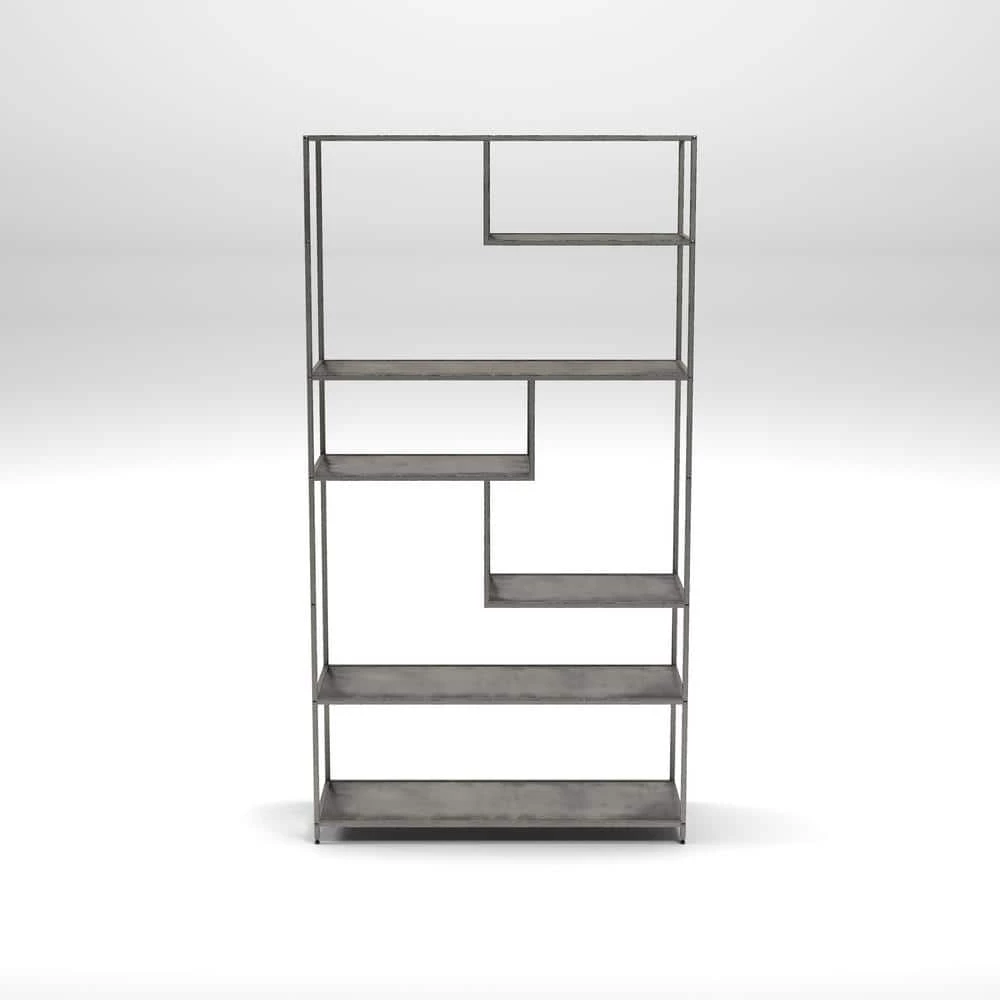 Provide a durable place to store belongings with the Emond Dark Gray Bookcase. The staggered shelving and sleek metal frame blend an industrial and modern look into one unique design. Bolt accents and wood shelves are additional features that bring out the rustic charm this piece has to offer.