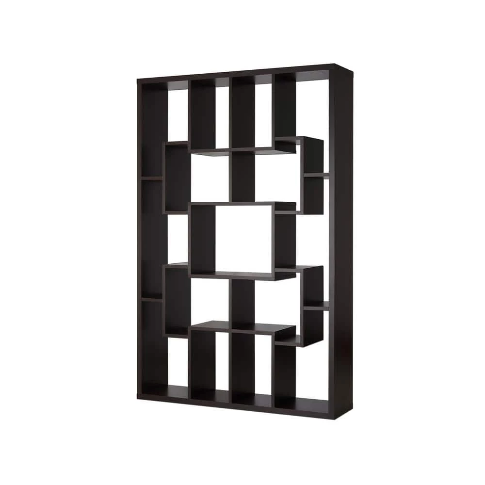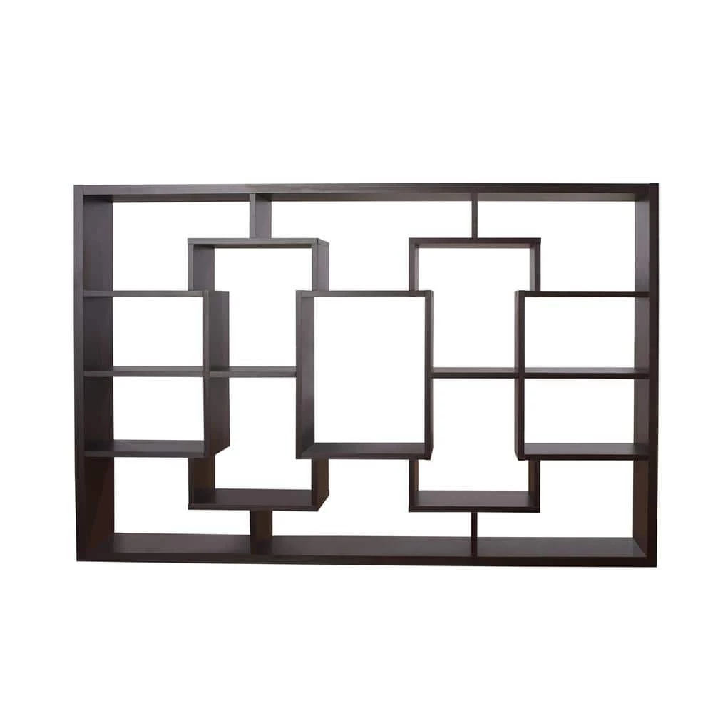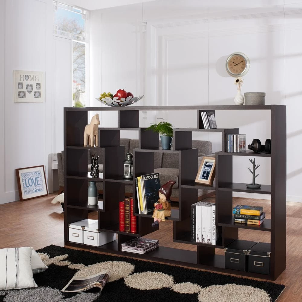 Stack books, frames and more atop the Gegal Walnut Bookcase and experience the ample storage space it can offer. Designed with sleek linear lines and geometric accents, this piece offers the best of modern design. The open back design allows the bookshelf to also act as a room divider to separate living and dining spaces.