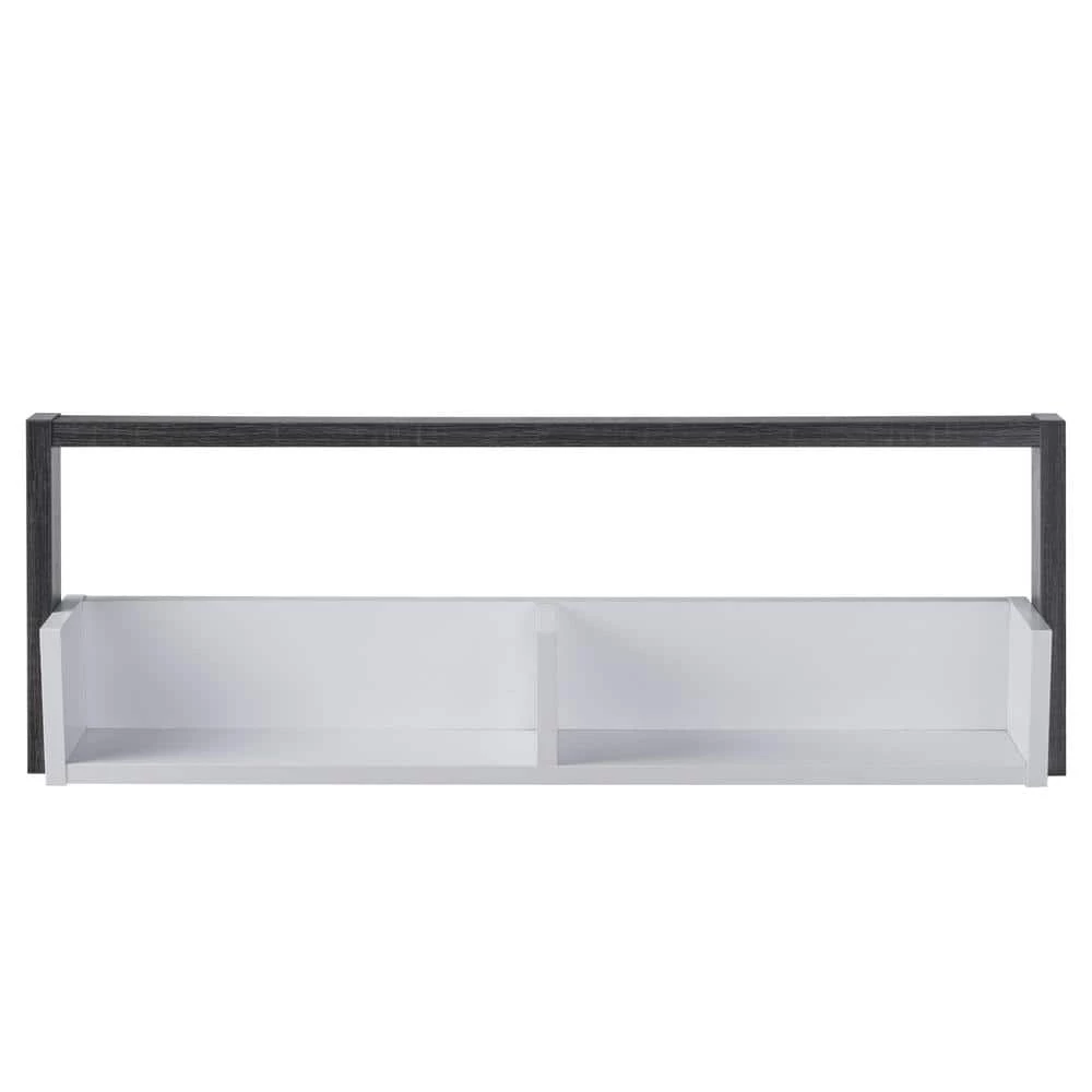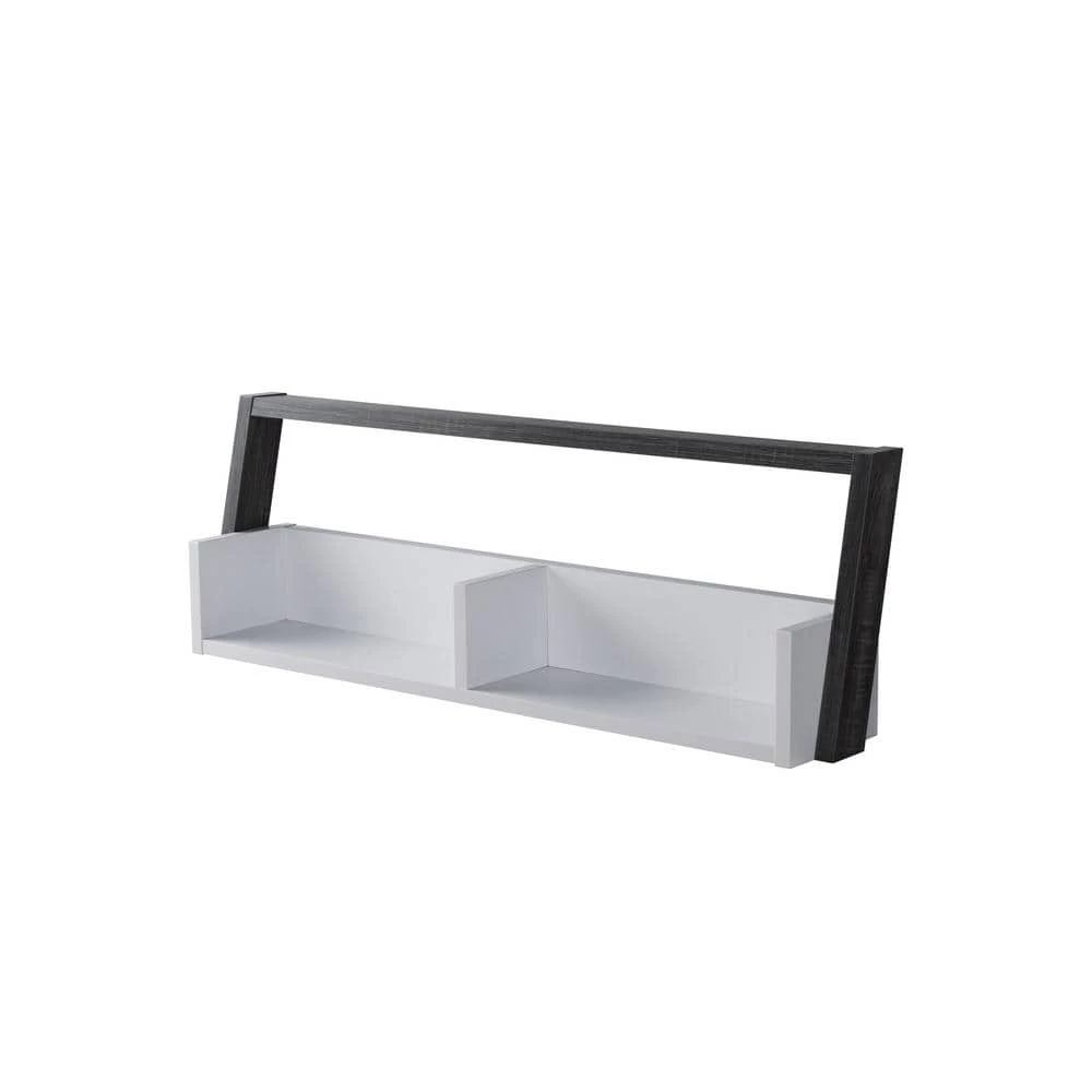 This two-toned floating console is a minimalist style that will fill those empty spaces in the home. The leaning design offers two-Shelves for extra storage in rooms that have exhausted floor space. Choose between a white and distressed grey or a white and natural finish.