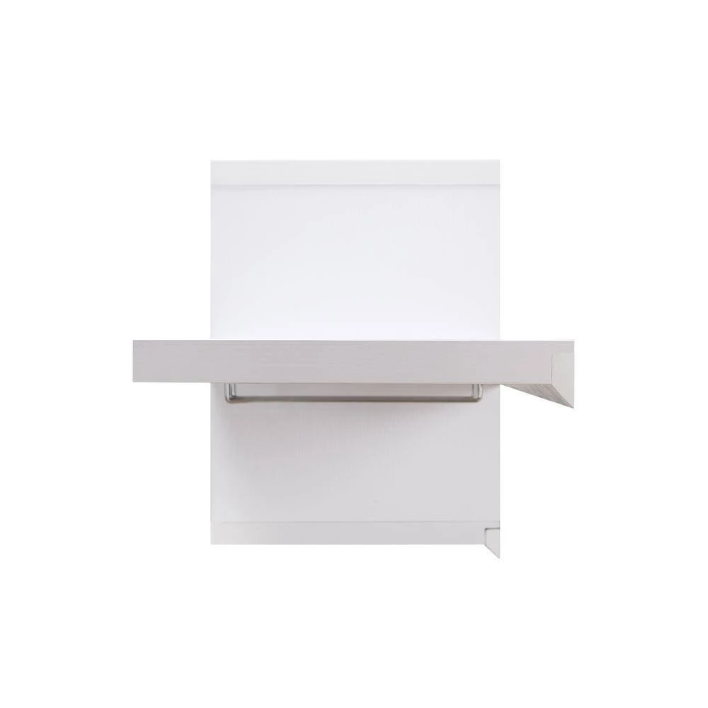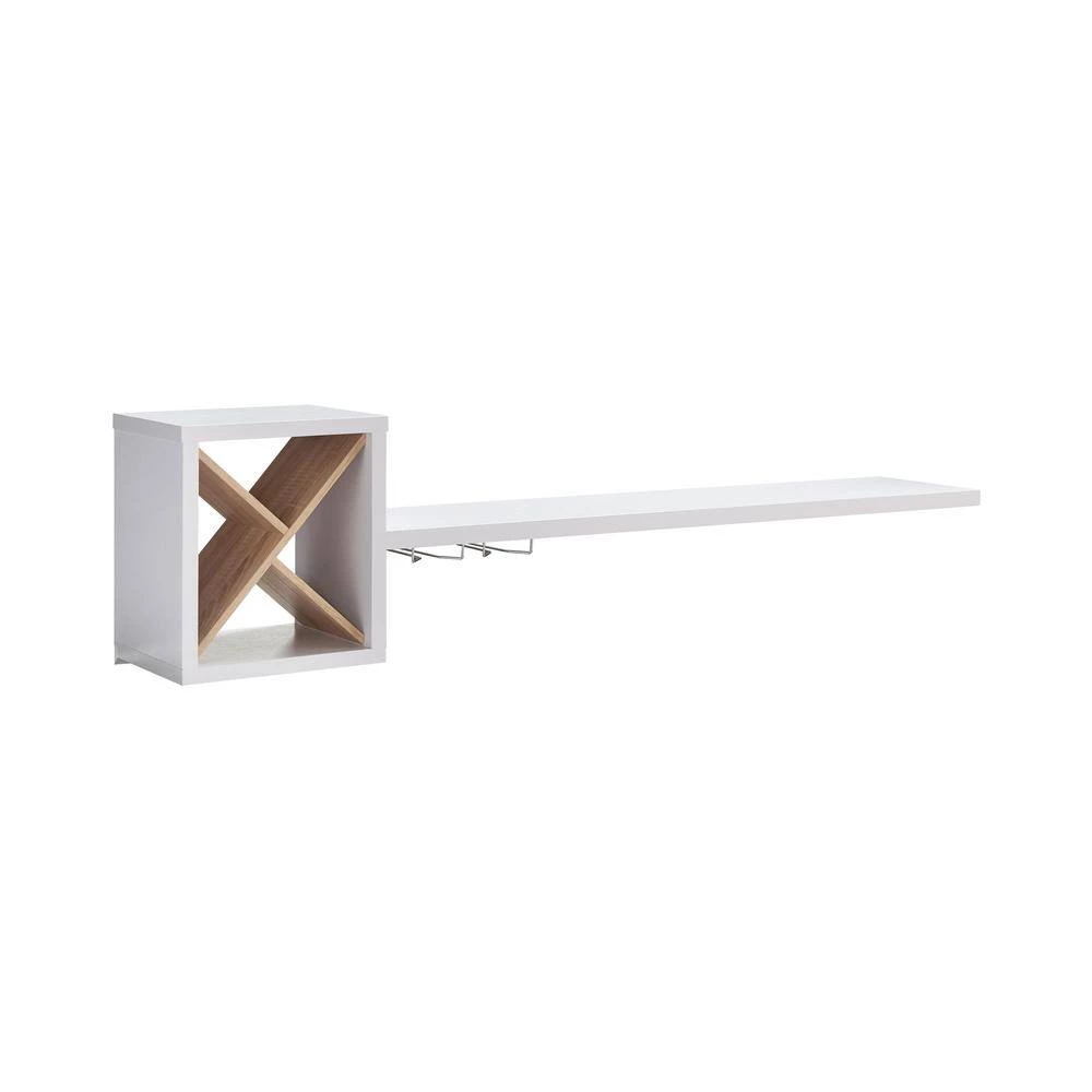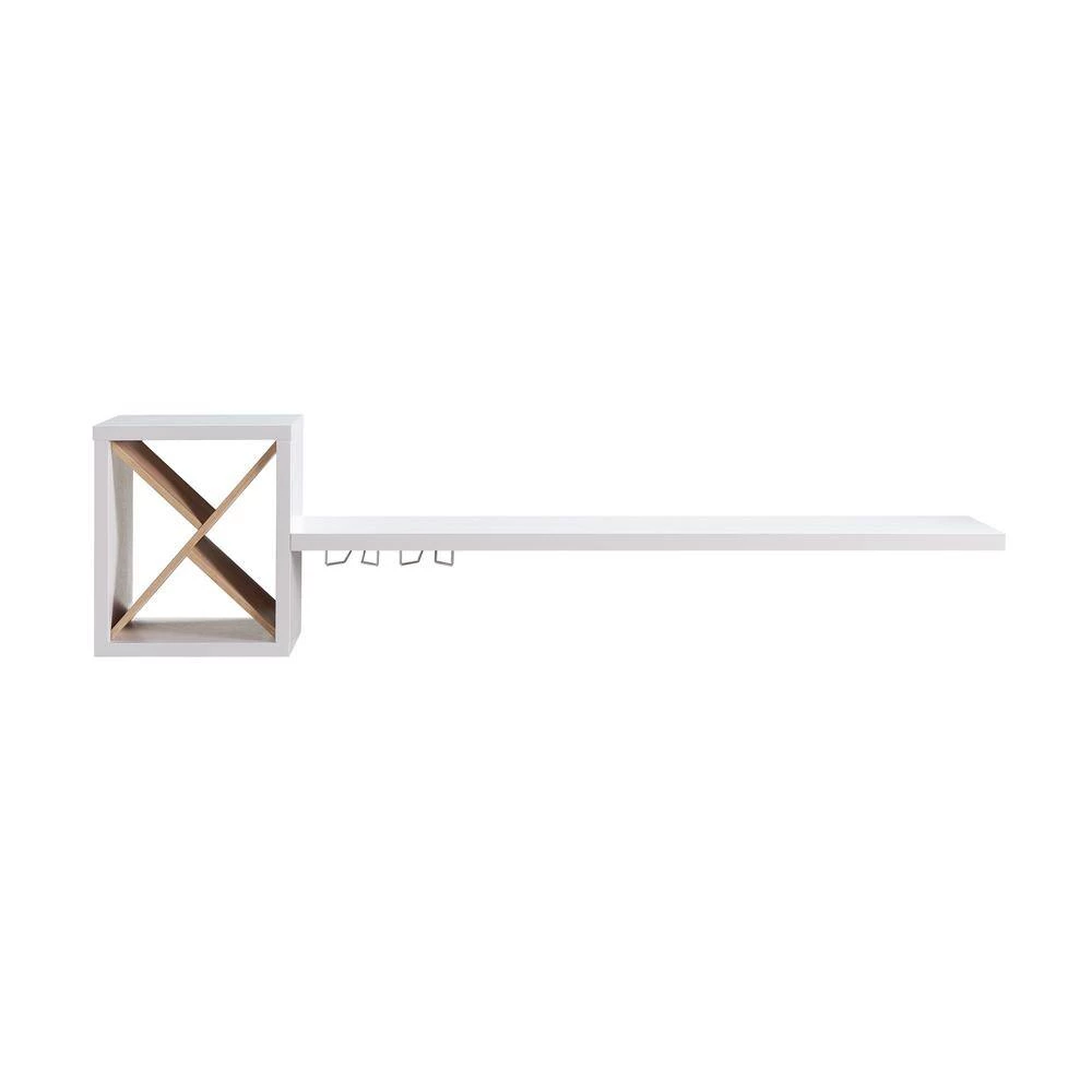 Preserve space in your kitchen, dining room, or entertainment room with this floating bar table. The wall-mountable cube’s shifted panels create unique compartments for bottle storage. A long and spacious table stretches out of the cube to greet guests in a mingling environment. Beneath this table is two silver metal stemware racks for an accessible serving station.