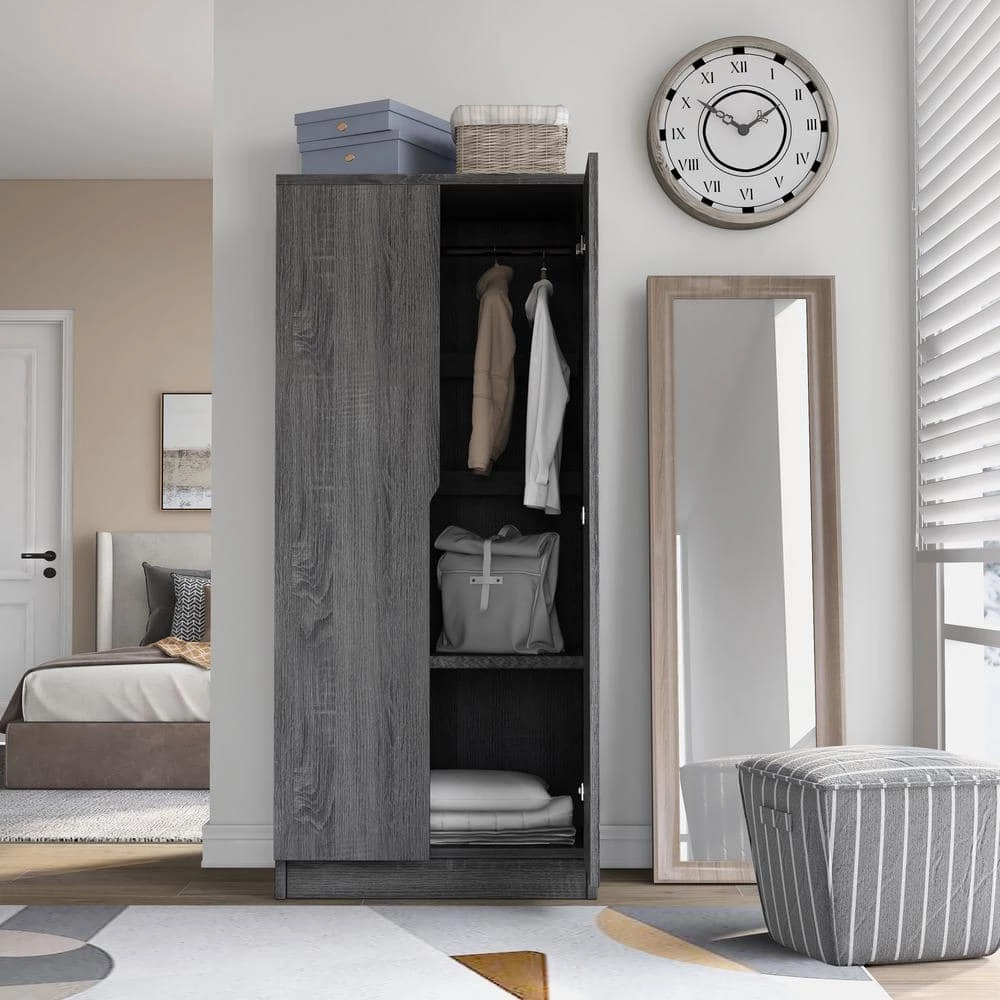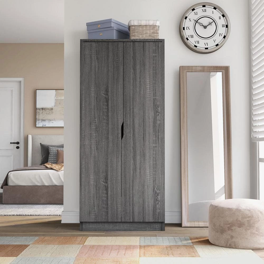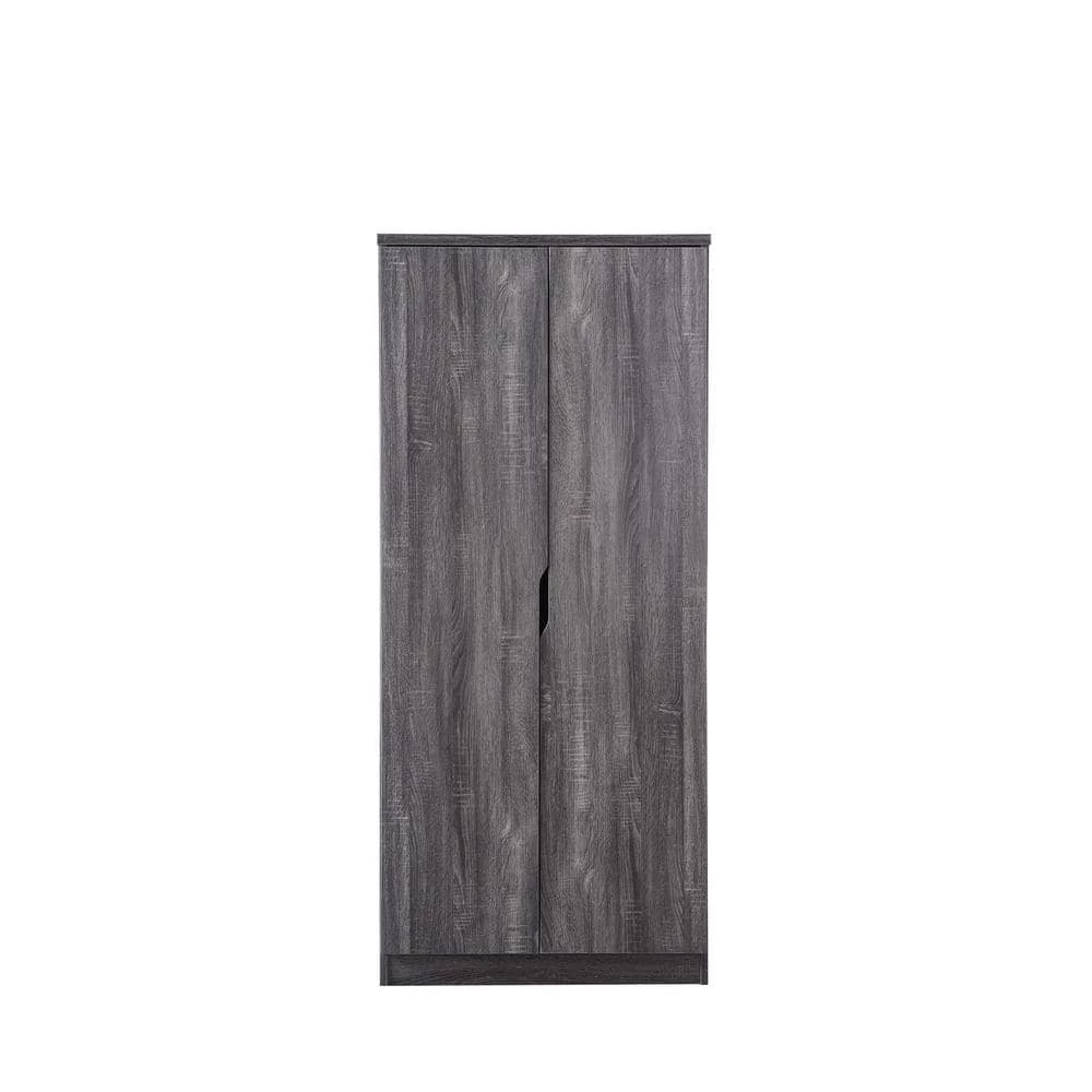 Furnish that closet-less extra room in your house with this modern wardrobe and create the perfect guest room. Contemporary cut-out handles are a minimalist design that opens the double doors to reveal a compact storage space. Inside you’ll find a metal hanging rod for guests to hang formal wear and 2-shelves for keeping extra towels, blankets, and pillows.