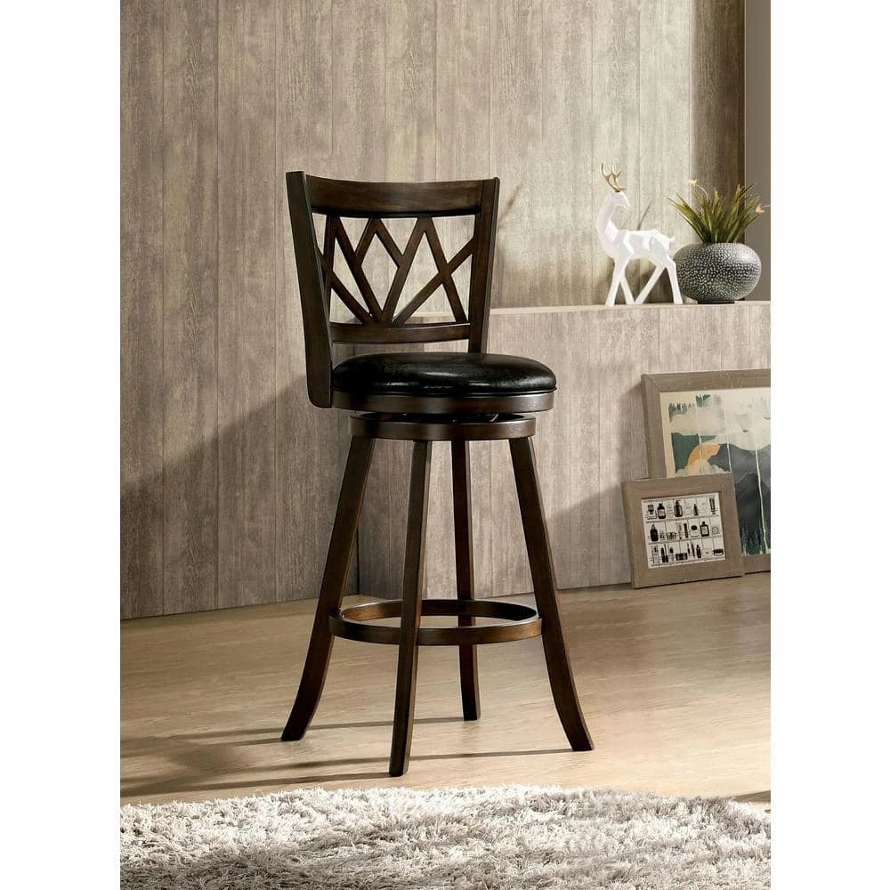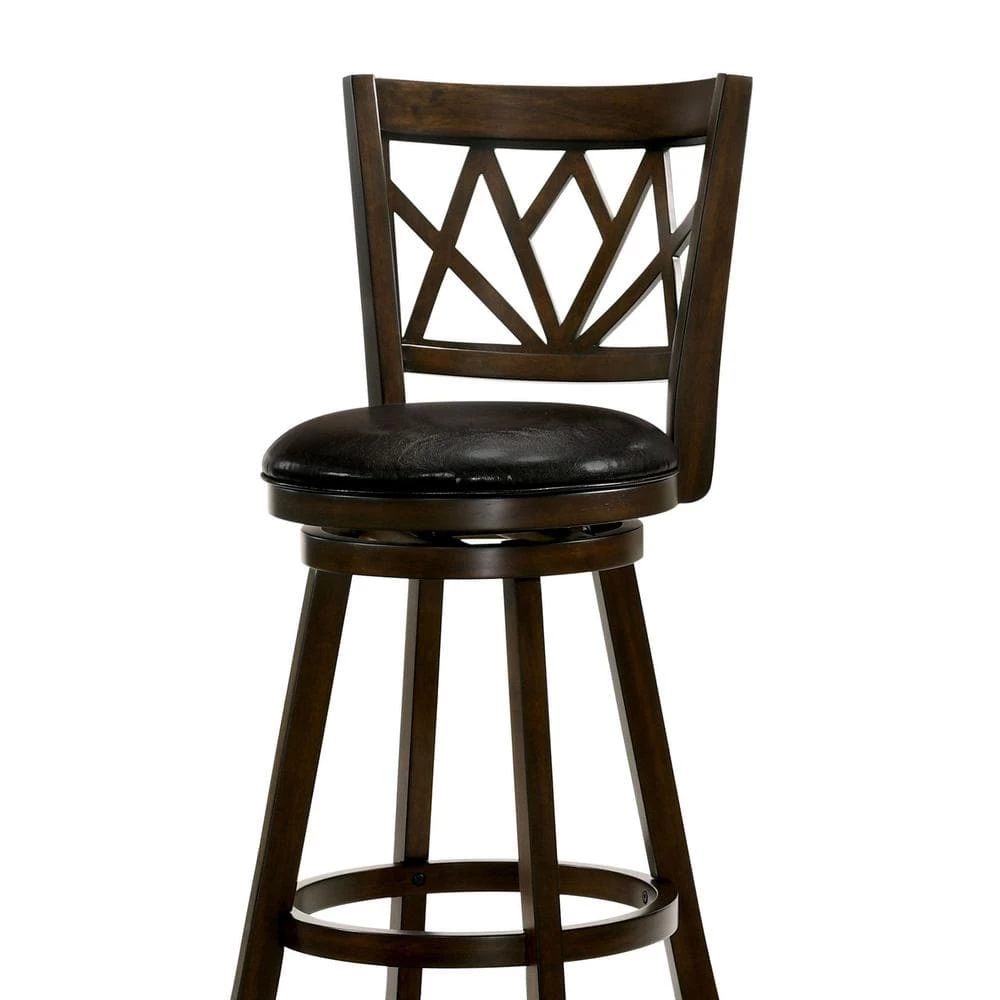 Invite your friends and family over for a fun dinner party and impress them with the wood 29″ bar stools in brown cherry. The seat back of the stool has a unique geometric cut-out design that is paired beautifully with a faux leather padded seat. This Barstool also has swivel ability for convenience.