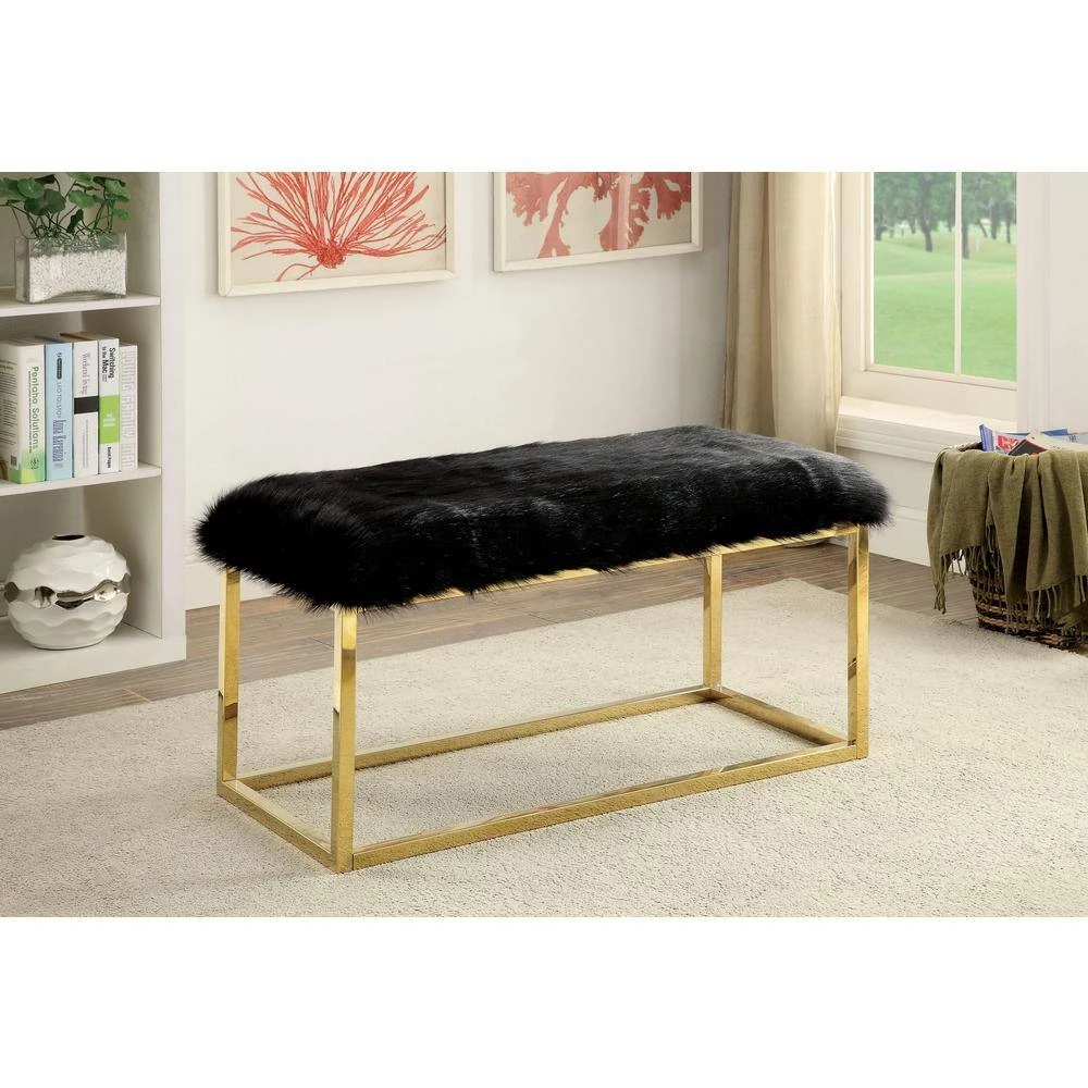 This bench features chic black finish faux fur fabric upholstery and a glamorous warm gold metallic frame. Take advantage of its diminutive size for a compact space. Rest in comfort on its padded seat while glimmering metal support creates a sophisticated transitional tone in your home. A throwback to the expressive 1970s, this bench infuses tons of personality as well as comfy seating.