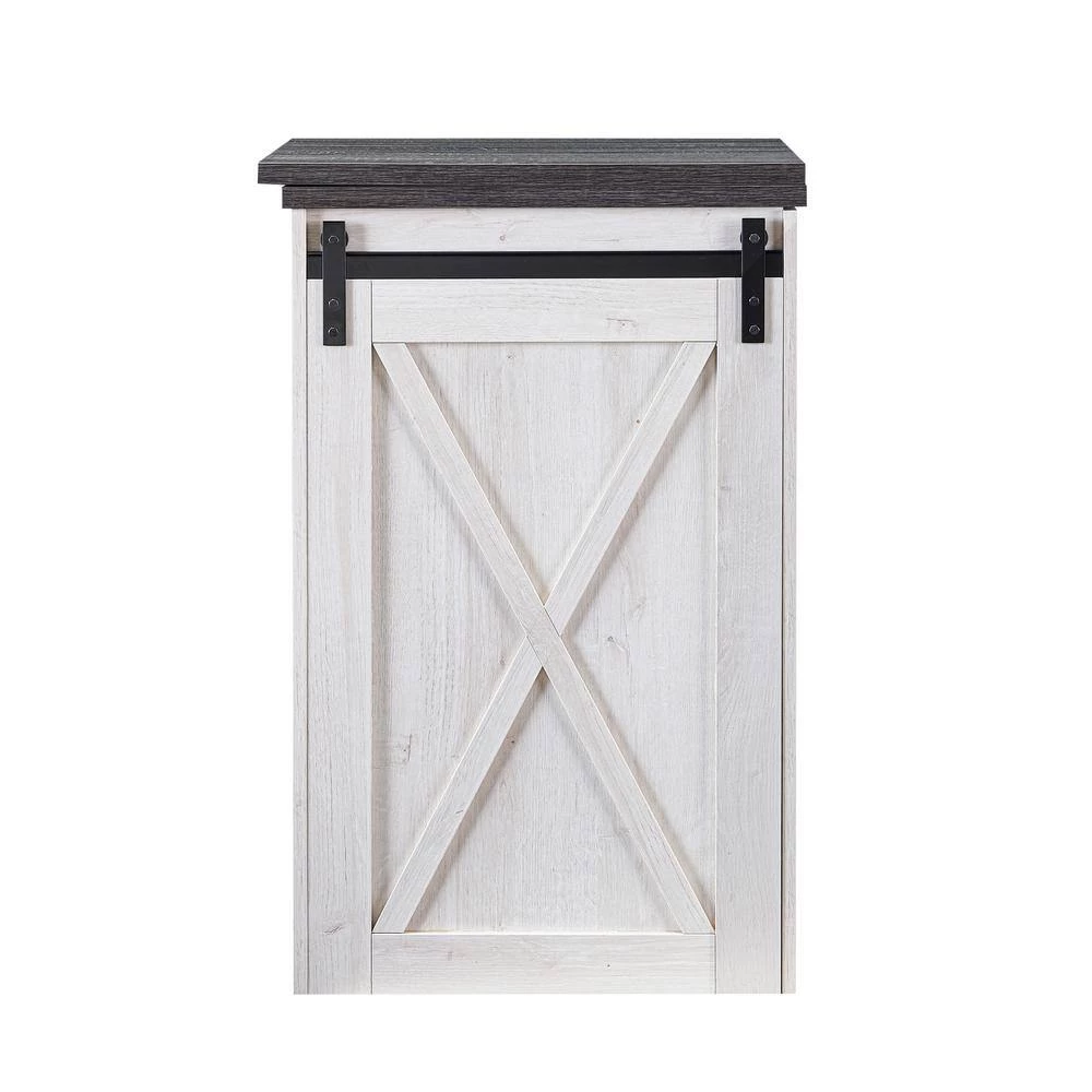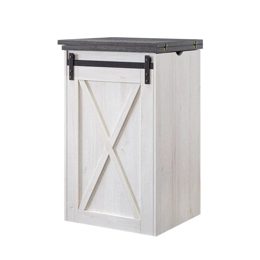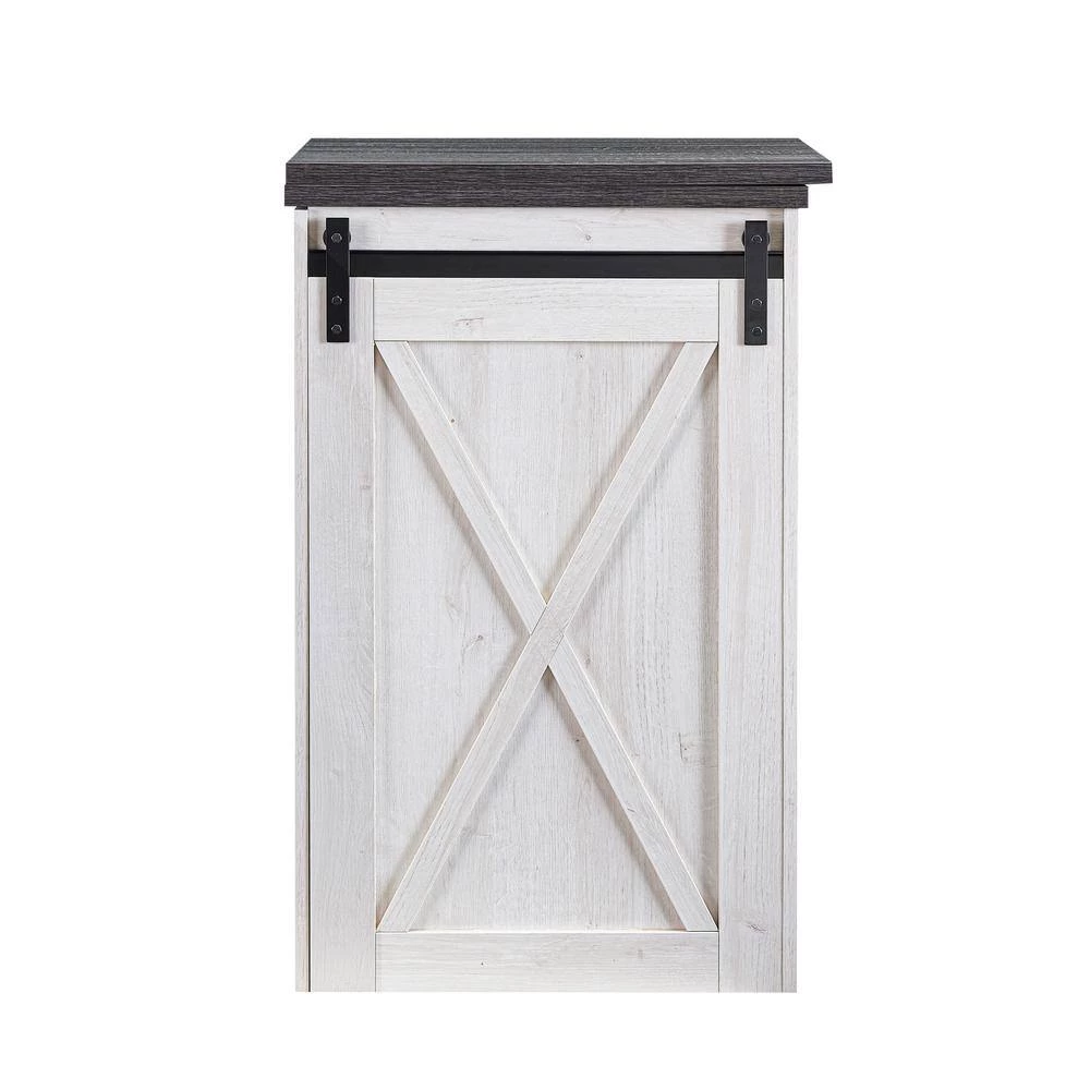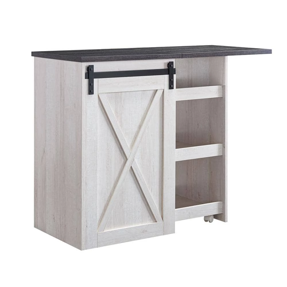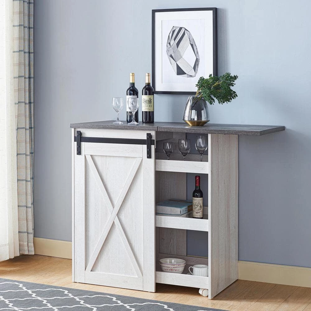 The space-conscious design of this bar table is a useful quality. Restore floor area while the stand displays a rustic barn house door in the kitchen or living room. When preparing for a party simply roll out the interior shelves with lipped edges and flip open the tabletop to widen the surface for drinks.