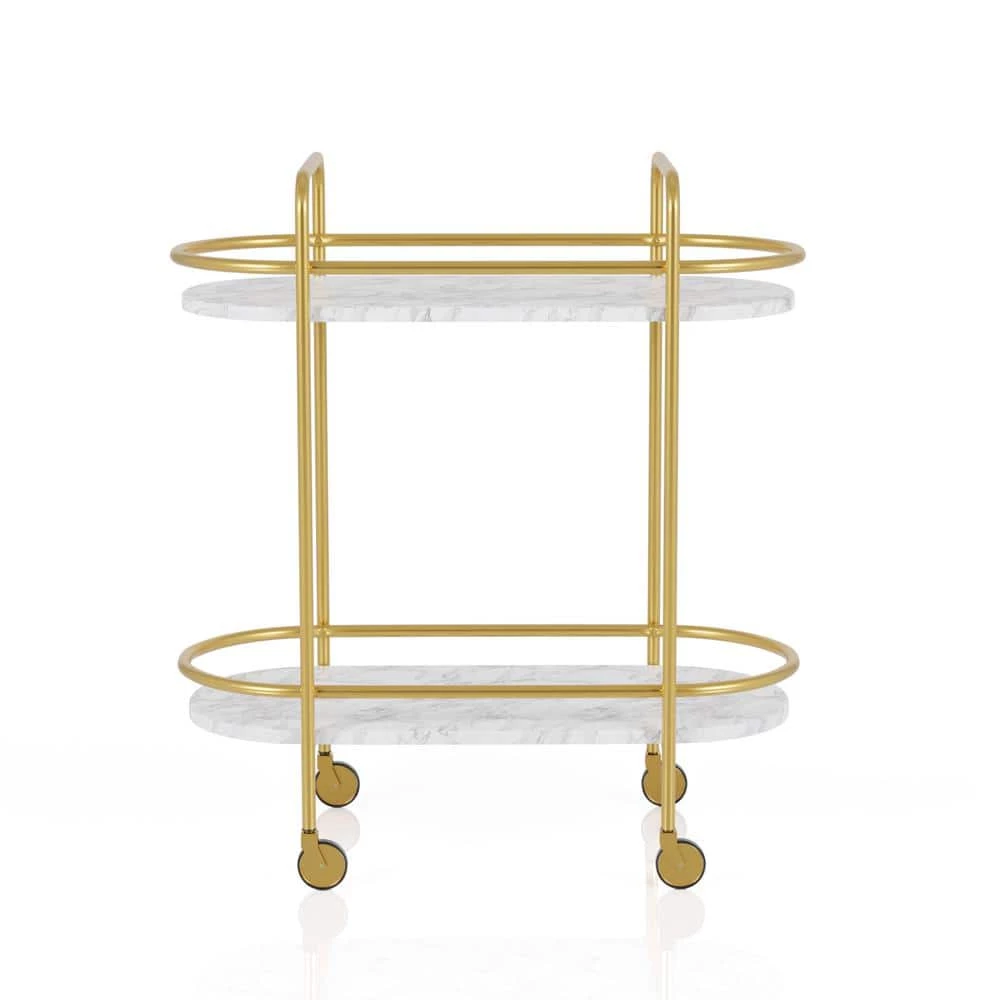 Up the contemporary glam factor in your living or dining room with this impressive 2-tier serving cart. In gold and faux white marble and boasting rounded ends, the cart is perfect for a sophisticated space and its light look and feel make it ideal for compact spaces. With the serving cart features a crate look and casters so that you can easily move it from room to room.