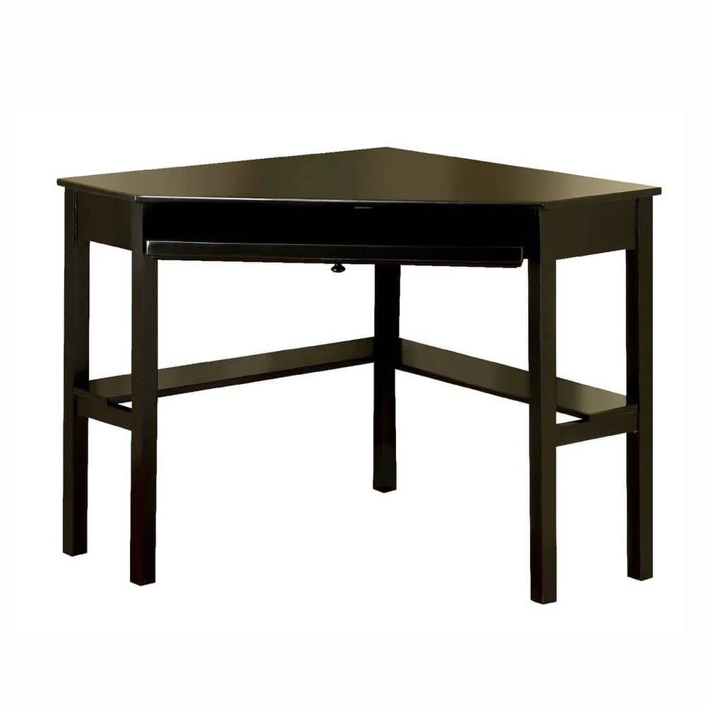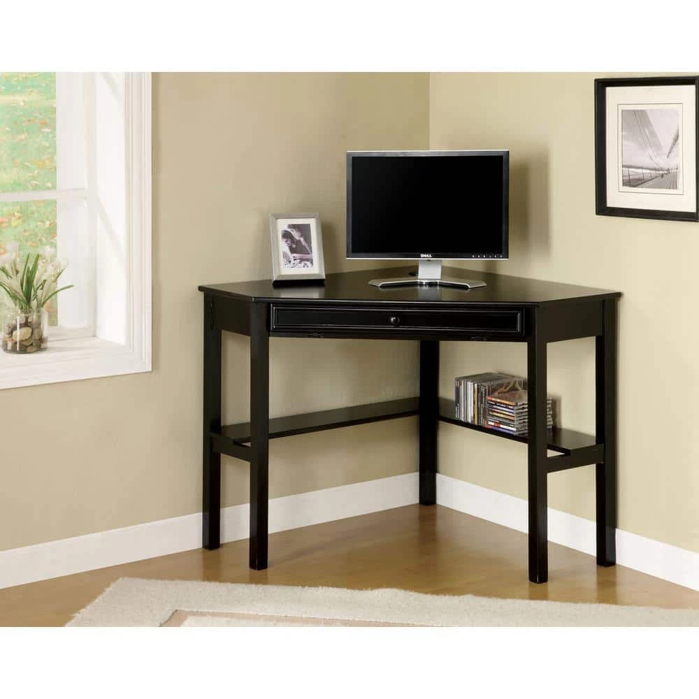 This Modern Corner Computer Desk in Black provides a relaxing place to work. Built from metal, wood, and glass, this space-saving unit works fabulously in a smaller room or office. Perfectly designed for corners, this piece saves precious room space as well as provides a personalized work area. Easily access the hidden keyboard tray through a faux-style drawer panel. The Modern Corner Computer Desk in Black is complete with a full under-desk shelf unit for small item storage and display space.