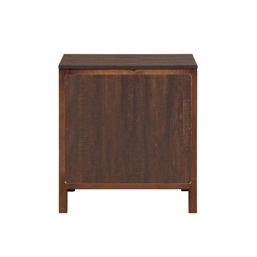 Tuck away all manner of bedside essentials within the stylish confines of this contemporary wood two-drawer nightstand. Perfect for a bedroom or even a living area, it boasts a rich walnut finish paired with roughhewn and grain details for a rustic, inviting look and feel. 2- drawers keep you organized while a wide top is ideal for books, decor, and a reading lamp. Metallic finish bar drawer pulls pair with a decorative arched apron to complete the look.