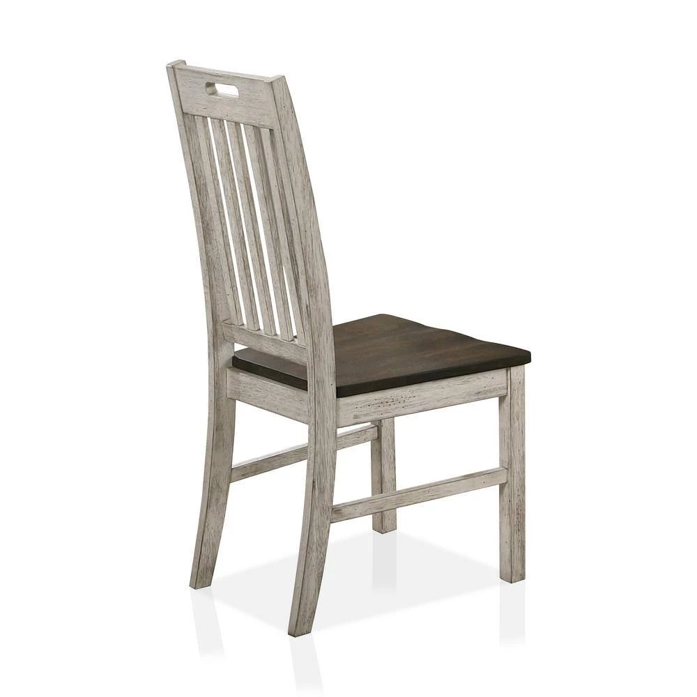 Modern farmhouse style is captured in this set of dining chairs. The antique white frames contrast with dark oak seats. Slatted back chairs are a country comfort design that welcomes conversation. This frame is made from recycled lumber, which had its beggings on a rubber tree farm. To prevent the traditional waste of natural resources through burning, rubber trees are retired into furniture.