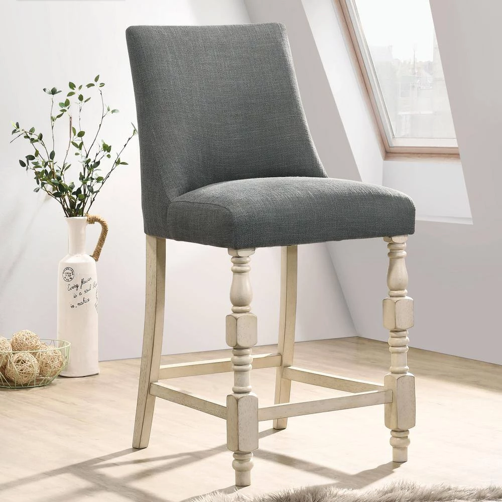 Add seating and style with this set of two transitional counter height chairs in your kitchen or dining room. Each chair features turned legs that add traditional flair to a dimensional ivory wood finish. Seats include full backs and are wrapped in plush cushions and dark gray fabric upholstery that offers a hint of contemporary appeal anywhere from a home bar to a kitchen island.