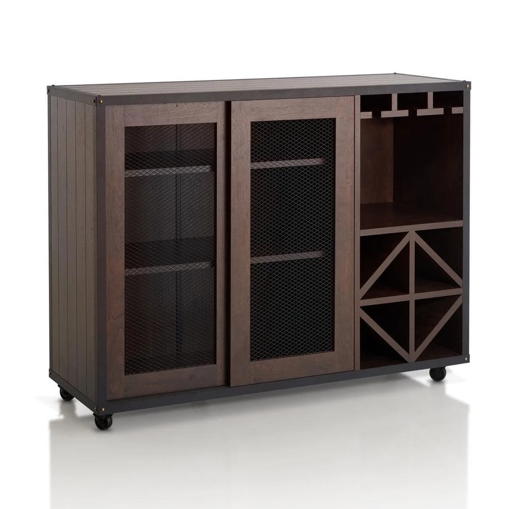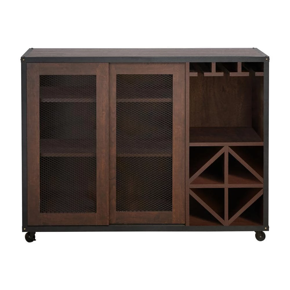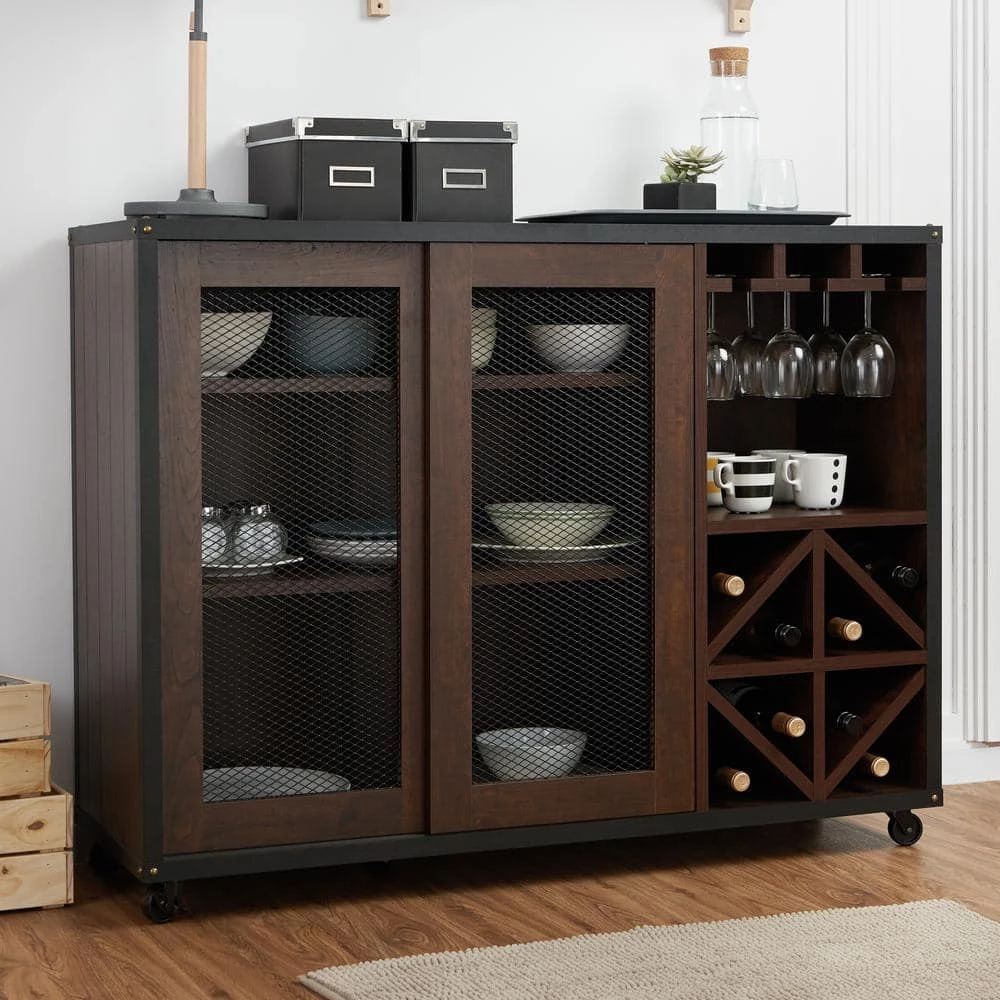 Move the sliding doors back and forth to reveal a plethora of storage in the Winston Walnut Buffet. The mesh doors, riveted trim, and caster wheels create an industrial design with an abundance of charm. Keep bottles and glasses neatly tucked away in the side wine and stemware racks for a well organized bar that will be the envy of all friends and family!