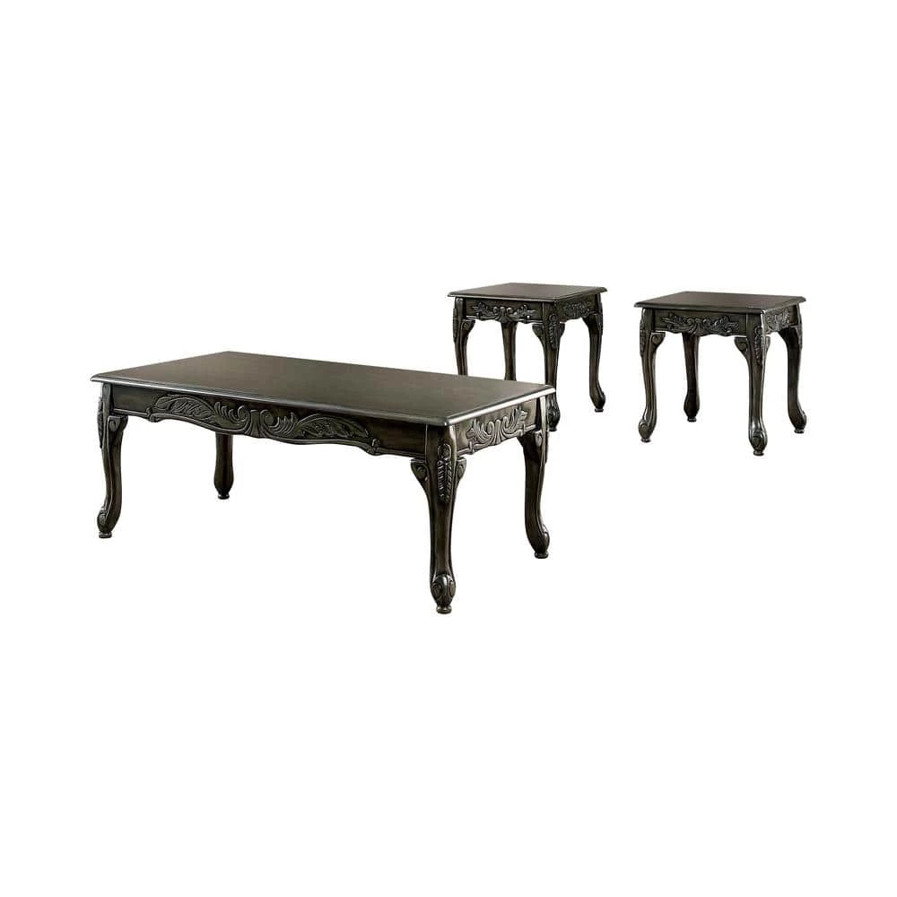 Stunningly sophisticated, this elegant set of tables is perfect for a traditional living space. Each piece features elaborate floral patterns carved into a solid wood and wood veneer frame in a beautiful gray finish. This three-piece occasional set is complete with a coffee table and two end tables for a complete living room upgrade.
