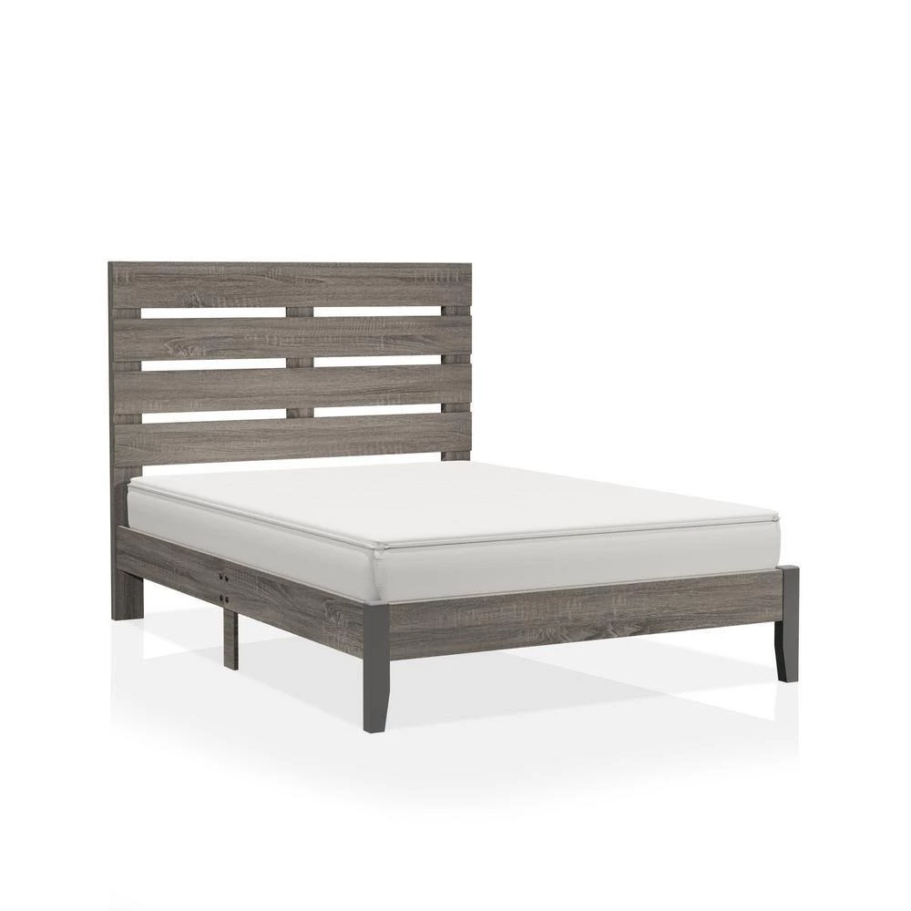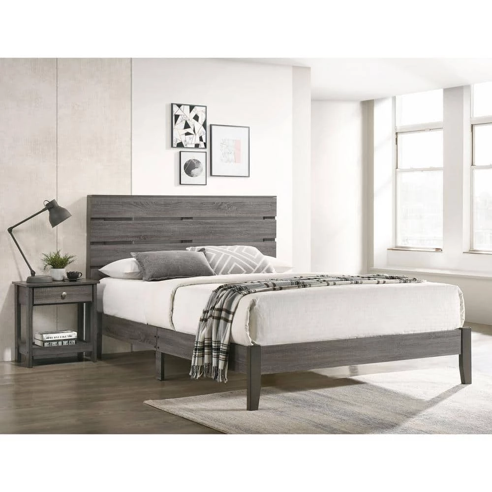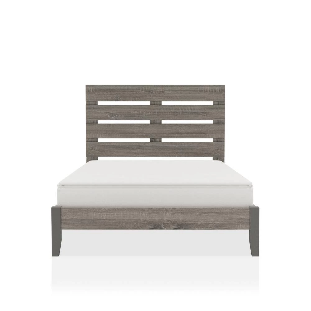 Clean up your bedroom with the clean, inviting style of this transitional bed, offered in multiple sizes. The bed boasts a modern silhouette with a headboard crafted from modestly spaced horizontal slat panels for a hint of farmhouse charm. The wooden bed is crafted with an appealing gray wood grain paper finish complementing the headboard and low-profile rails to add dimension to clean lines.
