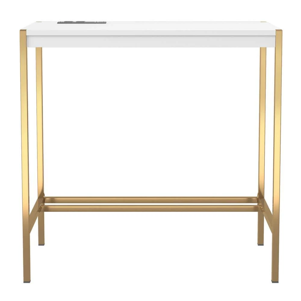 Mixing a gold finish base with a colored top, this contemporary writing desk offers a compact footprint perfect for a bedroom or living room nook. The desktop features a built-in USB and electrical panel that create easy access to plug in your laptop or charge your phone while you work. Clean and sleek, this writing desk is a fun addition that perks up any decor.