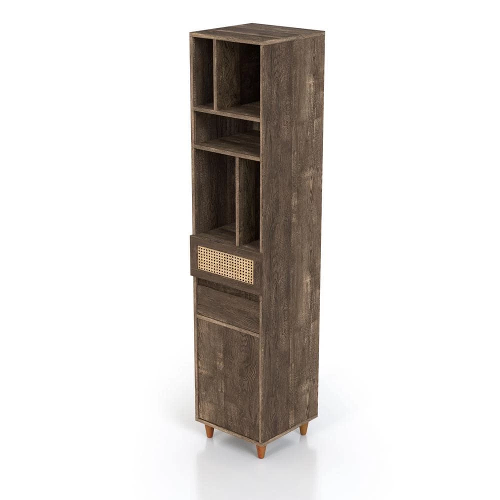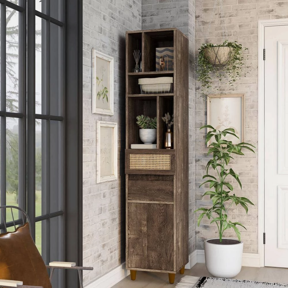 Mid-century modern style meets modern-day bohemian trends on this storage tower. The space-conscious design sits on adorable tapered feet and offers a modest mesh can webbed drawer. In addition to the five open shelves, hidden storage is found in a lower drawer and cabinet.