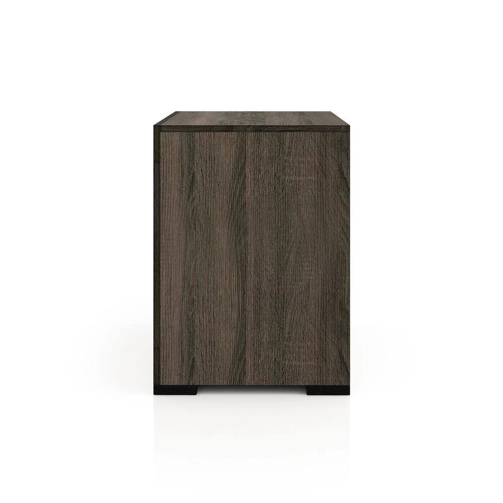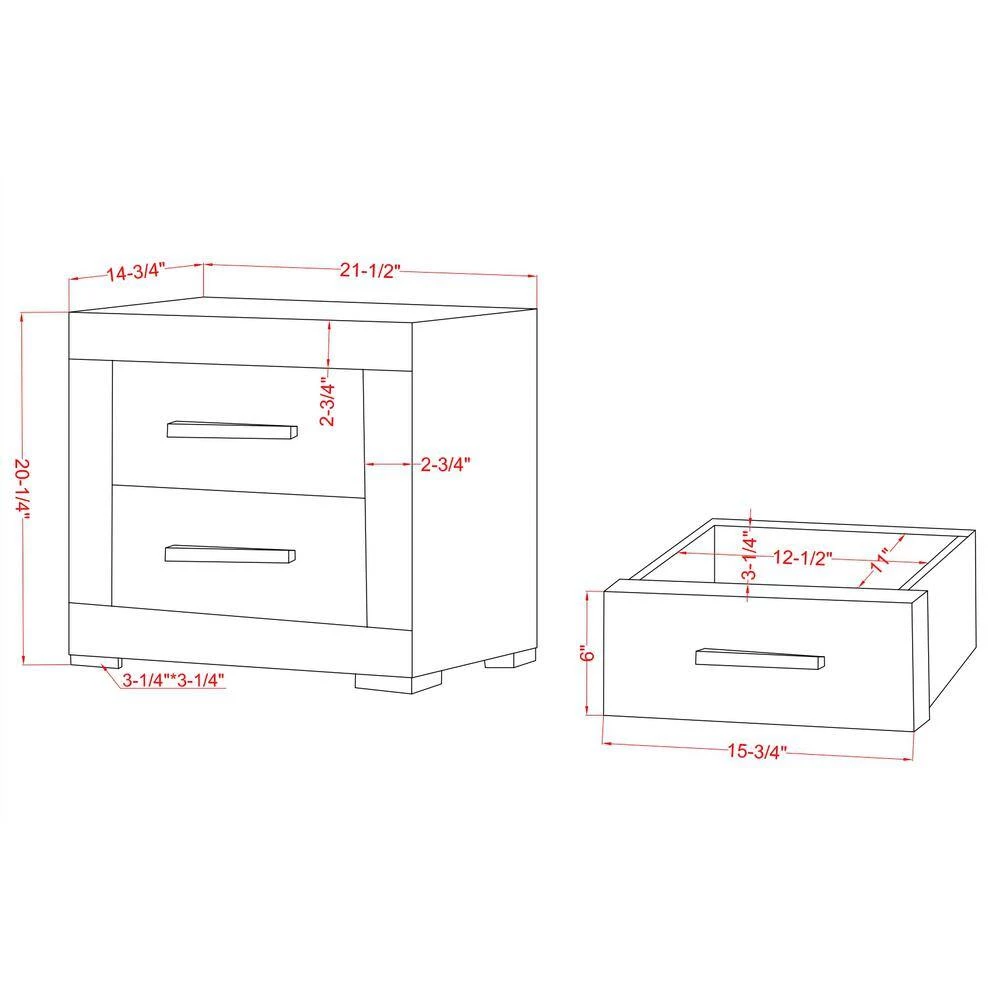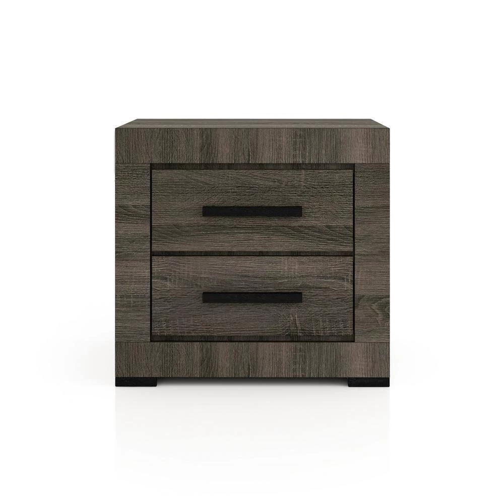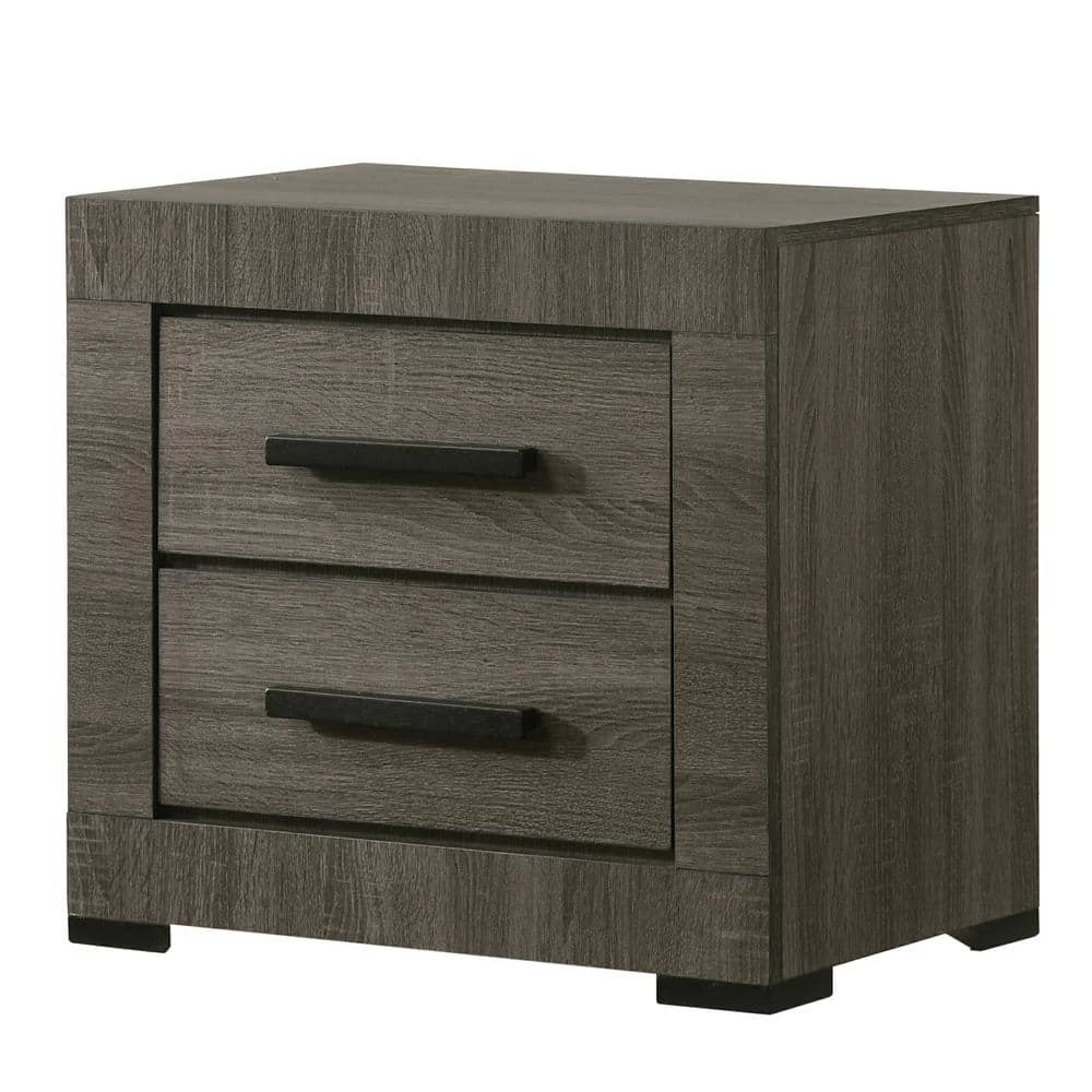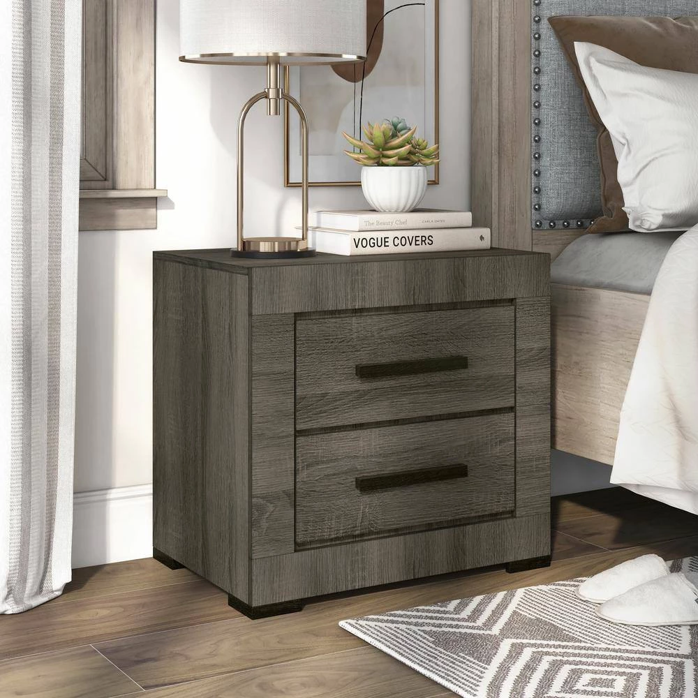 Modern masculinity is the face of this nightstand. A clean-cut cube frame on modest black feet is a simple, yet sophisticated, design. The wide black bar pulls of the two drawers are highlighted by the droved edges that evoke a deep and moody look.