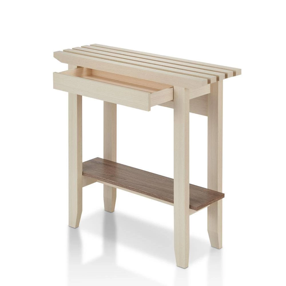 The Cane River Mid-Century Wood Console Table in brown finish is a stylish space-saving console table with loads of charm. Airy slats beautifully accent the tabletop and gently flare towards the ends. Items can be cleverly hidden inside the handleless drawer while decor can be showcased on the accenting shelf. Featuring an ivory and distressed taupe finish, you can refresh any home space with the Tamperu Mid-Century Console Table.