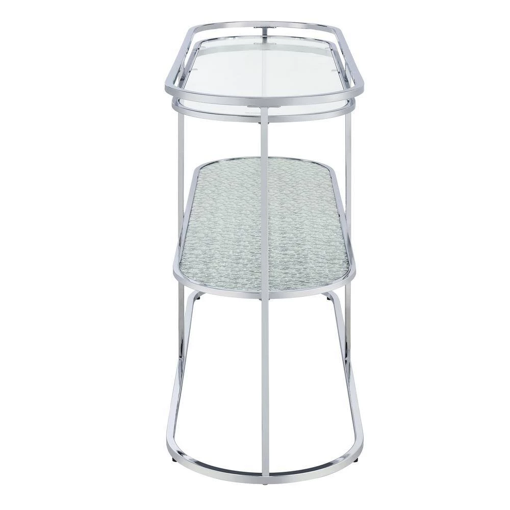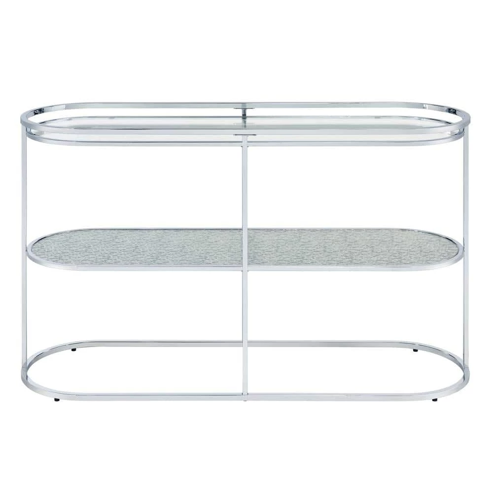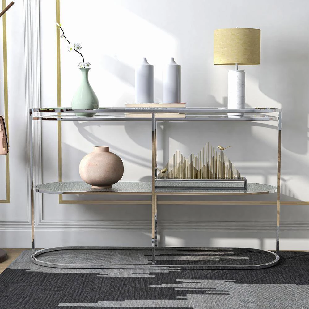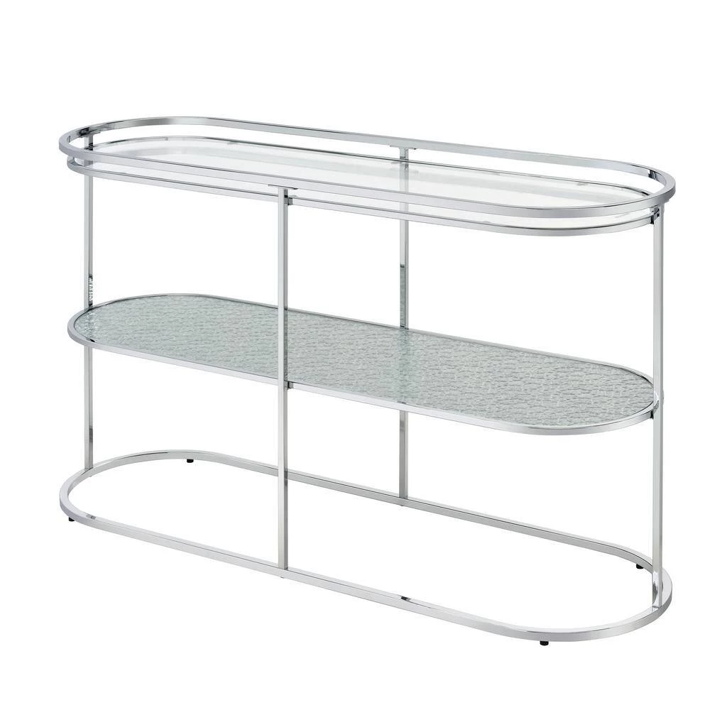 Catch the eye of friends and family alike with the stellar, modern style of this contemporary metal console table. Its oval shape and lower shelf bring eye-catching flair as the shelf create a compelling effect with rippled glass. The top is clear glass, ideal for showing off decor and greenery or flowers. A chrome finish completes the design with gleaming, modern appeal.