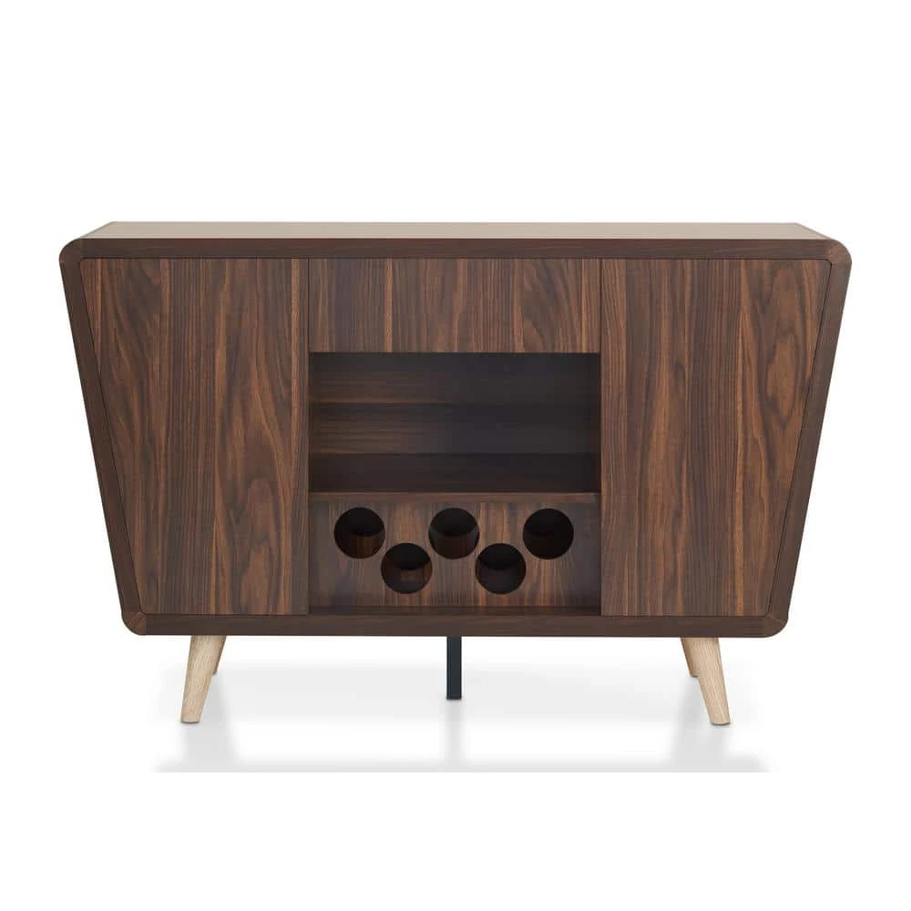 The angular structure and unique wood grain of the Celvin Dark Walnut Buffet create a trendy, mid-century modern design with retro flair. The tapered peg legs feature a natural tone finish to continue the retro feel while provide added durability. Multiple shelves and wine storage ensure functionality is maximized.