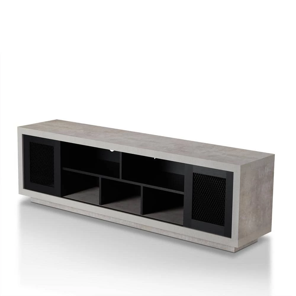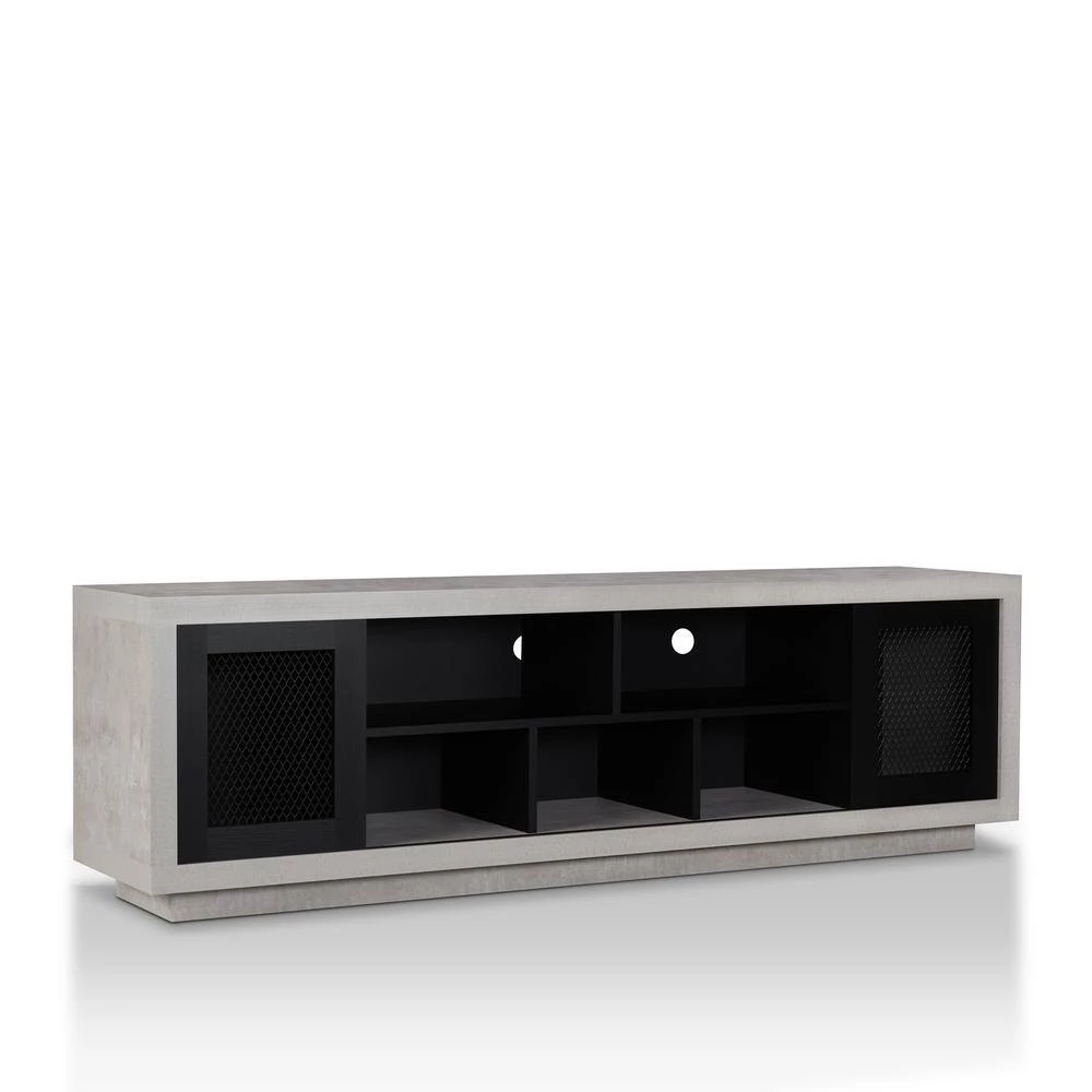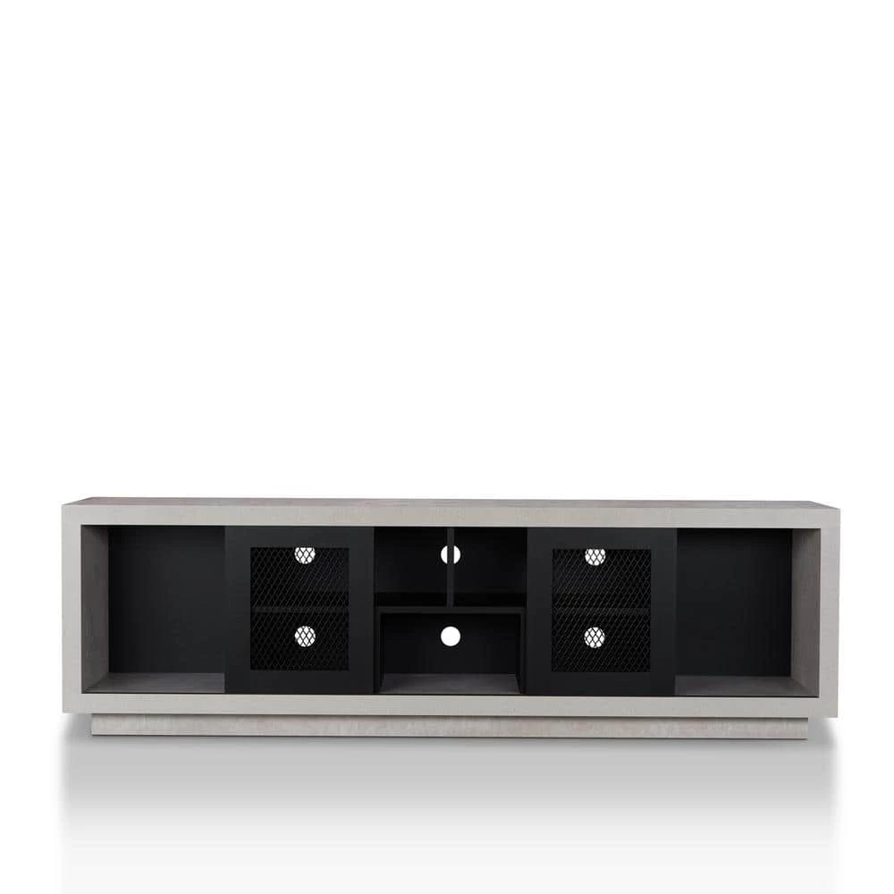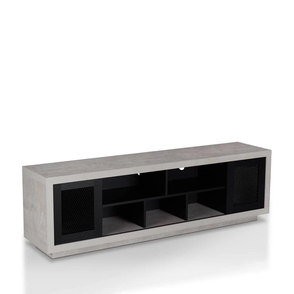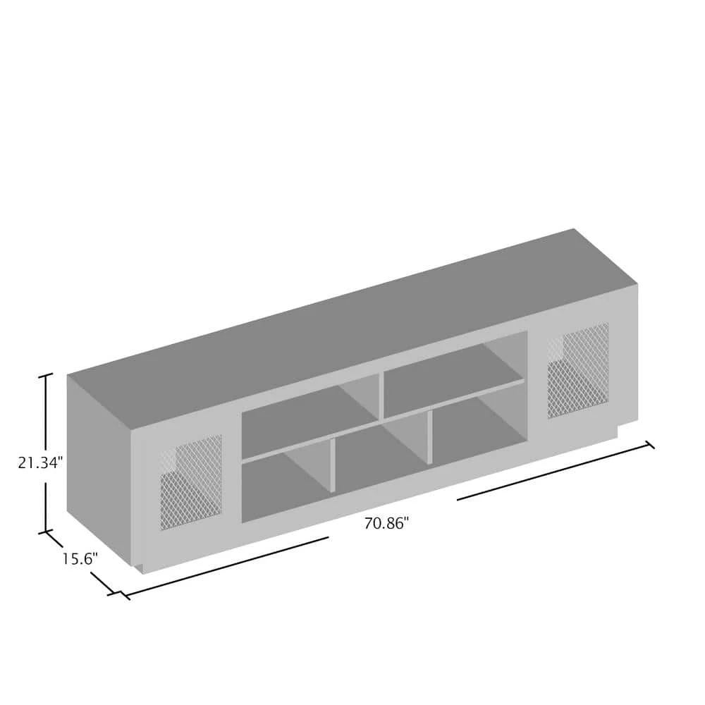 Refine your entertainment space by Chapin Cement-Like 71 in. TV Stand. Features in cement-like framework for an industrial appeal. Multiple compartments create a maximum storage capacity while two sliding doors with mesh inserted accents. Spacious flat top can hold up to a 71-in. flat screen. Rear wire access for greater convenience. Oversize: 21.75 in. H x 70.86 in. W x 15.6 in. D; Top shelf size: 7.44 in. H x 19.68 in. W x 13.54 in. D; Bottom shelf size: 7.44 in. H x 12.9 in. W x 13.54 in. D; Side compartment space: 15.5 in. H x 13.1 in. W x 14.1 in. D. Weight capacity: 100 lbs. Available in Black or Distressed walnut finish, sold separately. Assembly required with hardware, instruction sheet included.