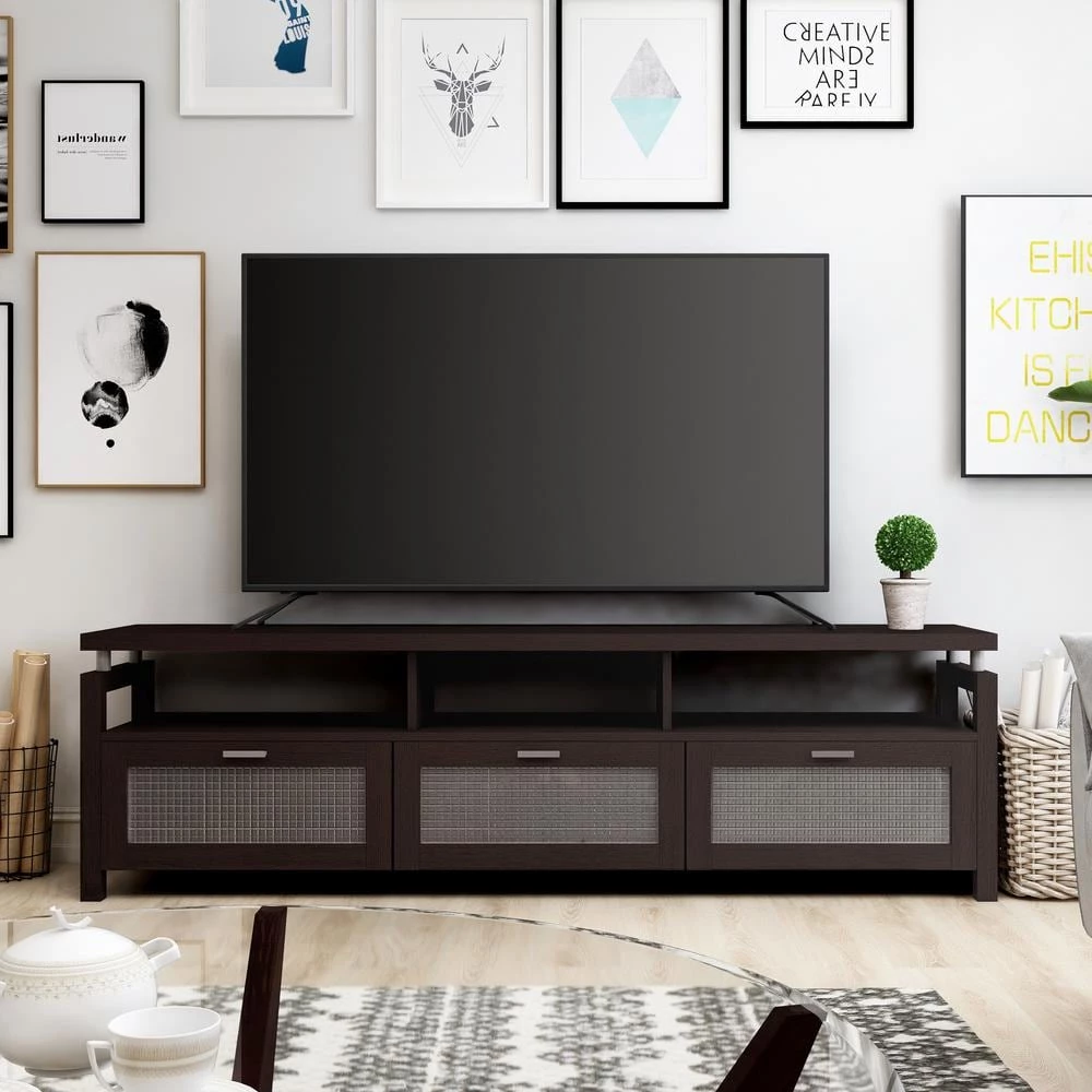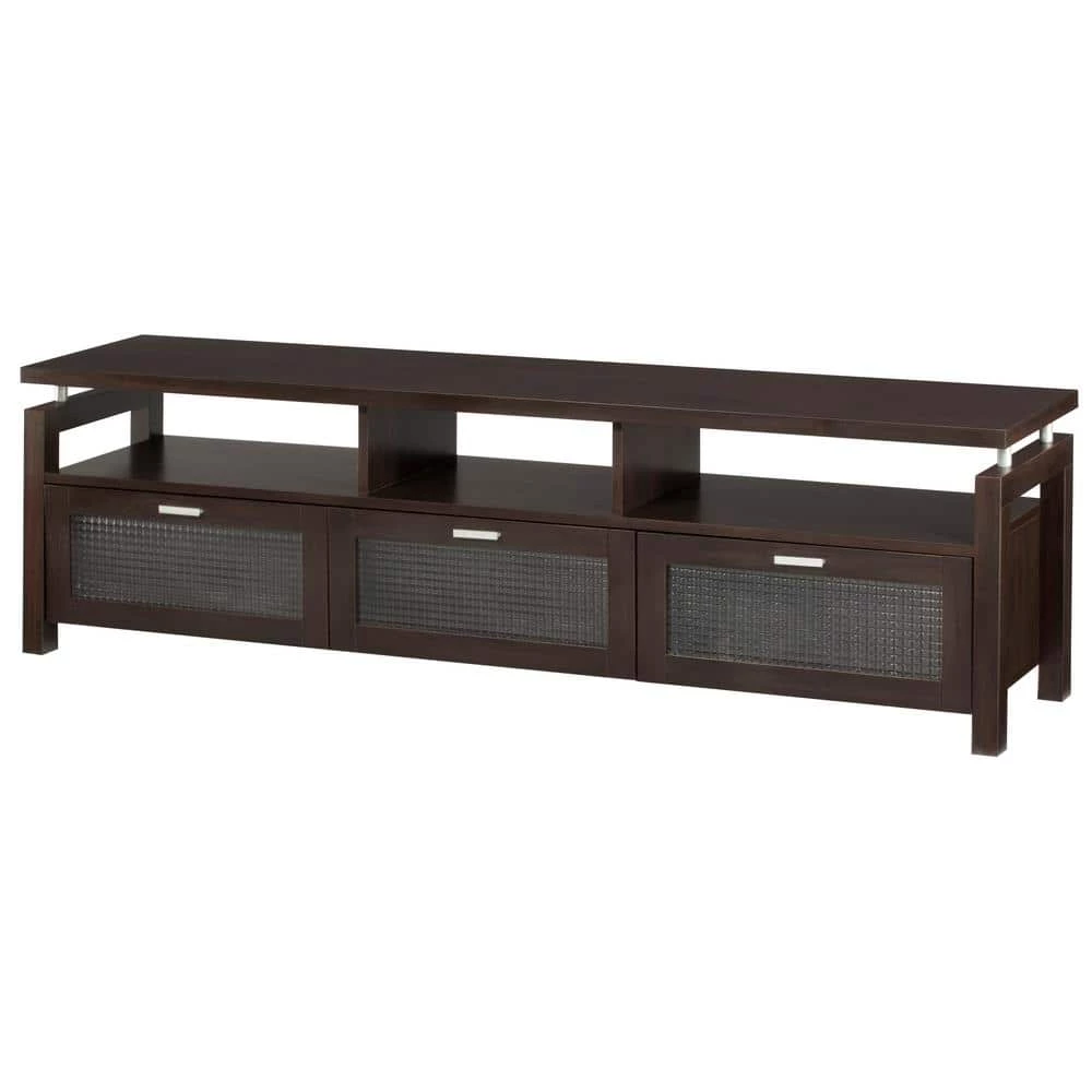 Update your home with the rich finish and silver accents of the Chence Espresso TV Stand. The raised top adds a fun modern visual and provides extra space for the open shelving to fit all your electronic needs. The textured frosted panels fold-down to reveal enclosed storage for additional movies and games.