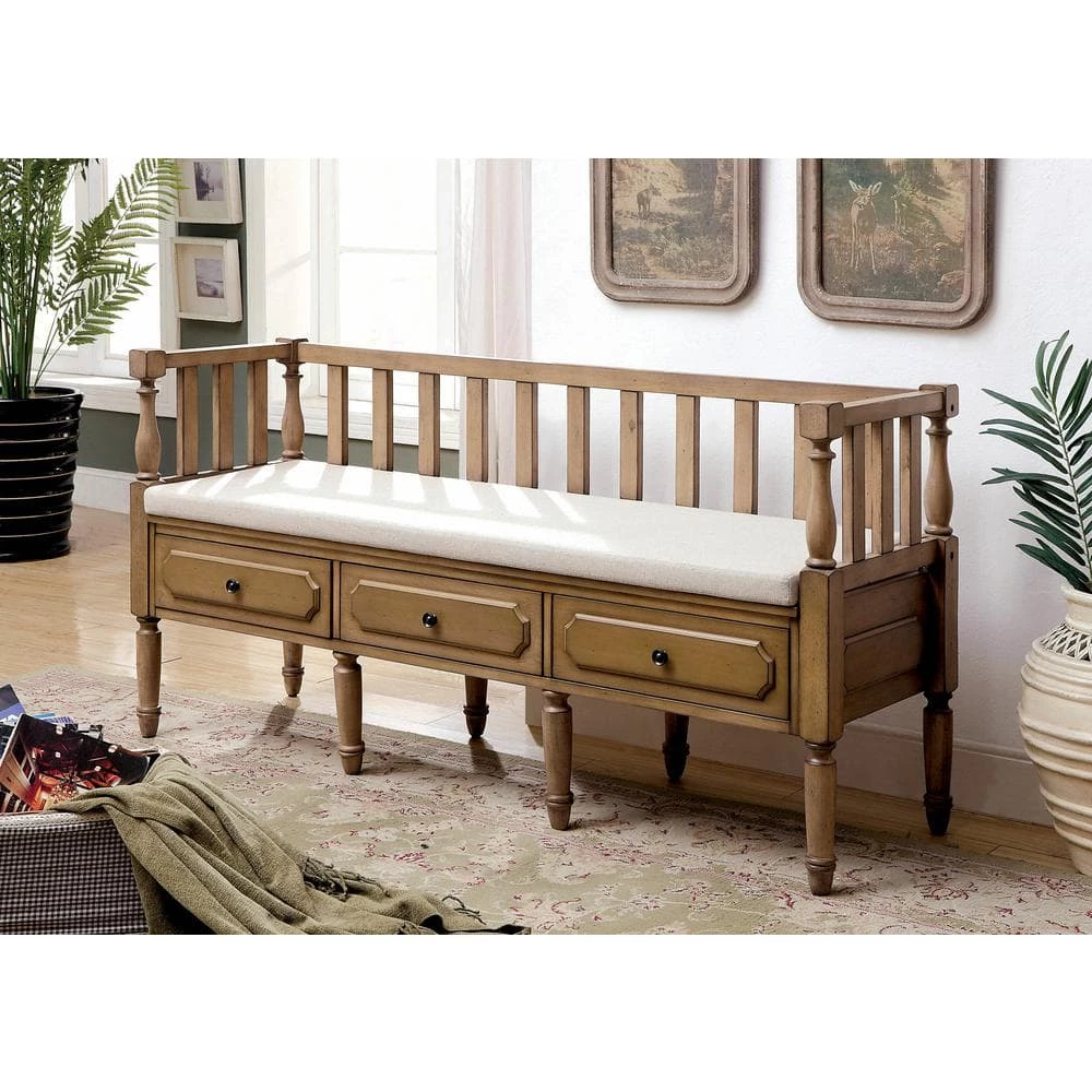 Refine the look of your home with this natural tone storage bench. Turned supports frame each side of the bench while slatted wood construction creates an inviting look along the back rest. Fabric upholstered seats are complemented by comfy foam filling, ensuring ample support. Conveniently store reading materials and extra blankets with 3 paneled drawers that are easily accessed beneath the seat. Crafted from sturdy solid wood, the Cherryvale Bench elevates your living room or entryway to sophisticated Transitional style.