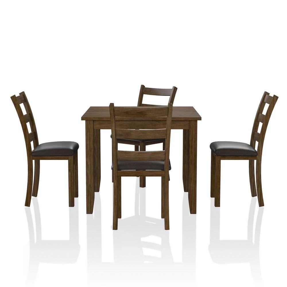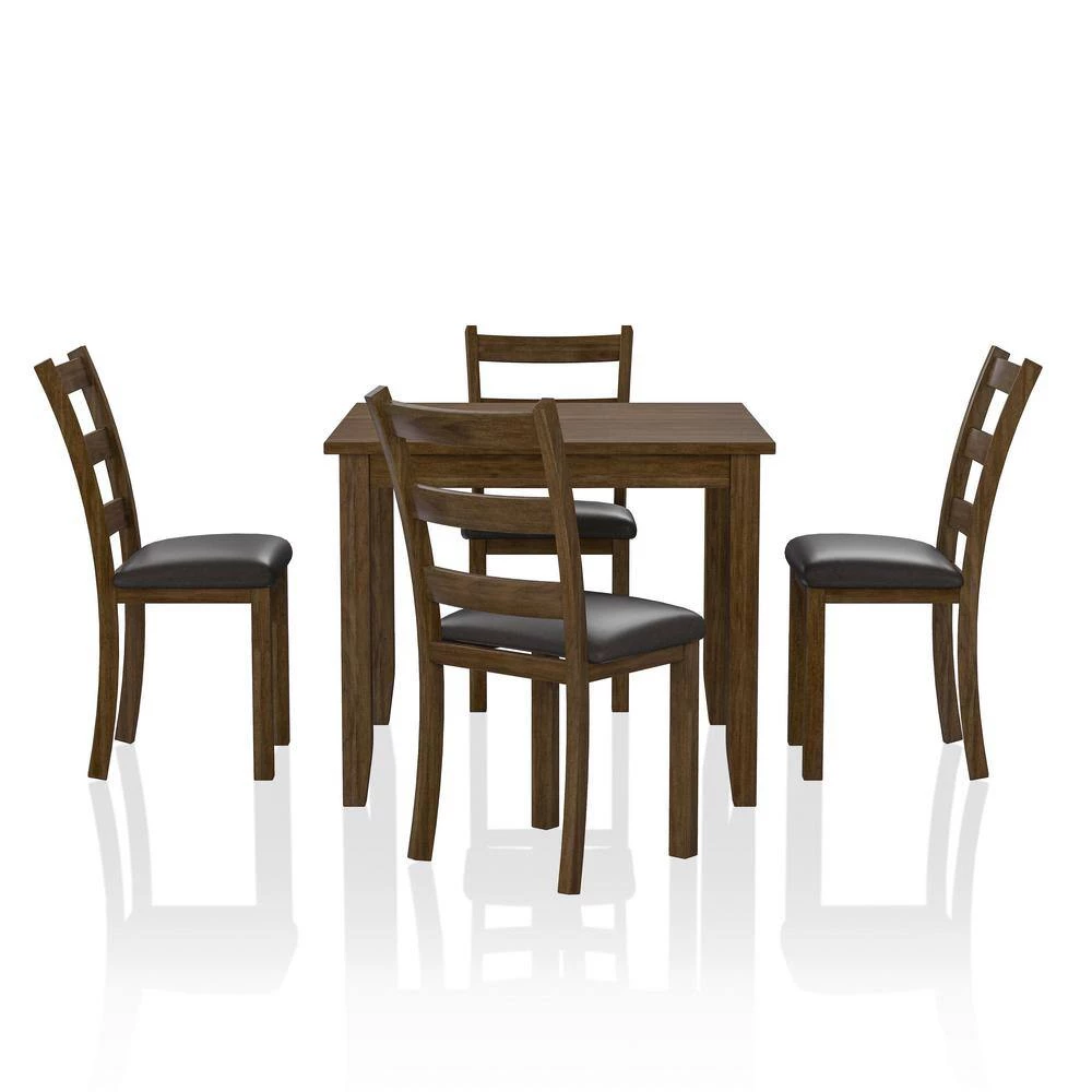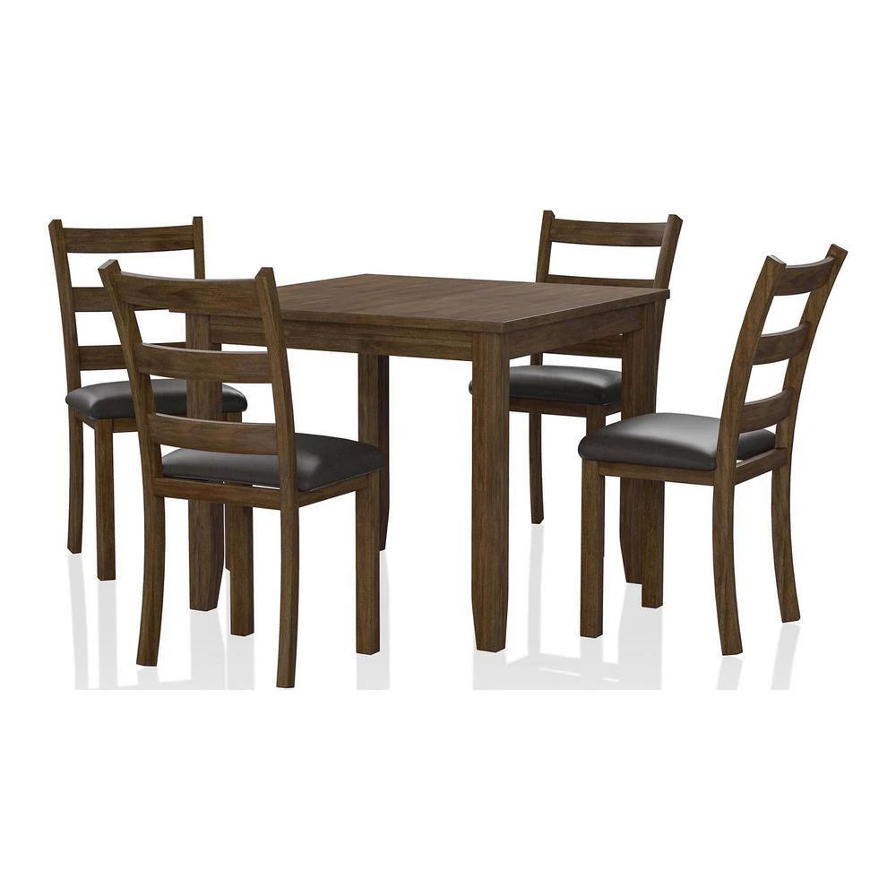 The ideal dining table set for 4-is beautifully crafted in a walnut finish, bringing out the best of transitional design for nearly any dining space. The dining table set comes complete with 4-ladder back matching chairs, upholstered in a dark brown leatherette material that contrasts with the table. Enjoy meals for every occasion around this dining room set, perfectly suited for a family of 4 or gathering with friends for a fun evening.