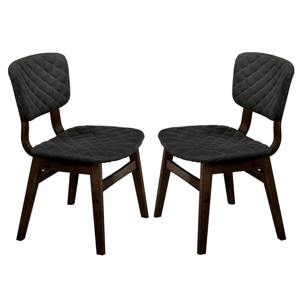 - Gray fabric upholstery and walnut finish deliver a sophisticated two-tone look to your dining room