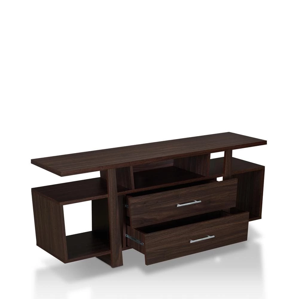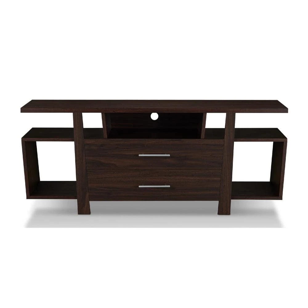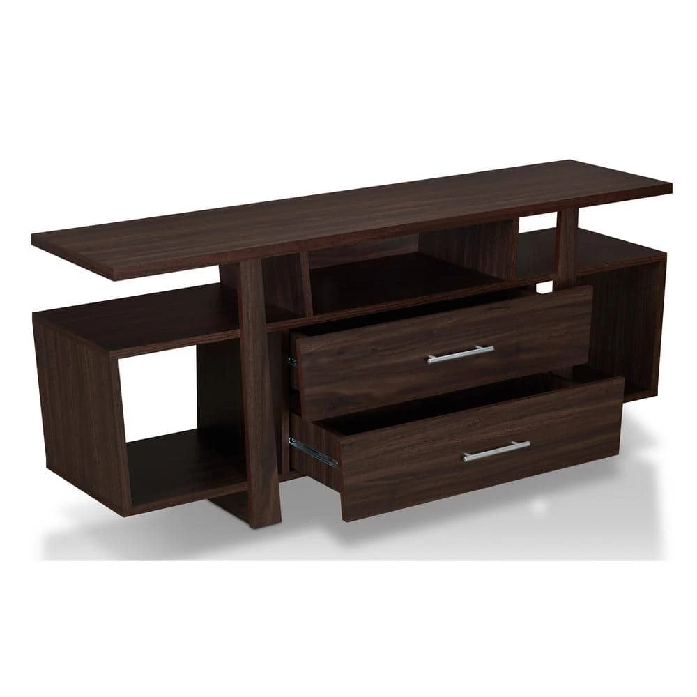 The TV stand features a streamlined, modern design that helps create an airy, open aesthetic. Use the TV stand’s wide tabletop to showcase your modern TV while various sized shelves help store all your entertainment devices. Center drawers detail wide bar handles and offer additional storage for movies, games and more! Crafted of MDF, this TV stand elevates any modern home.