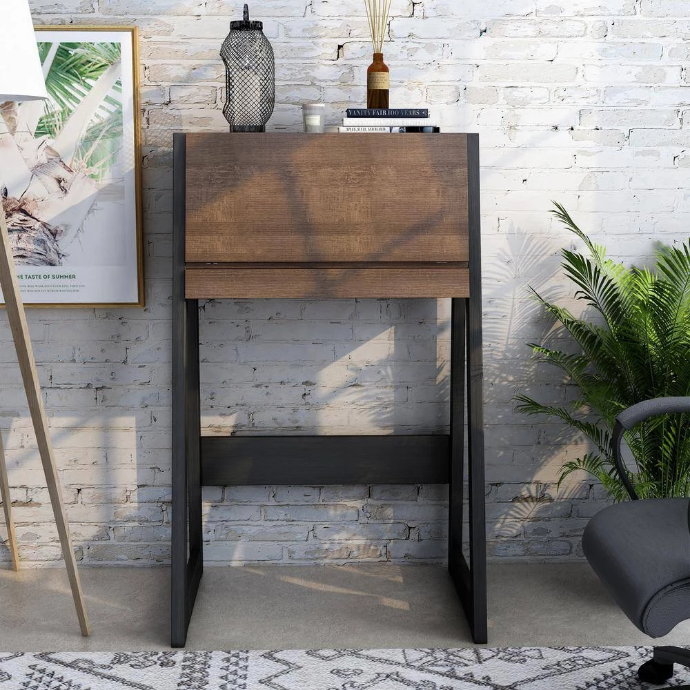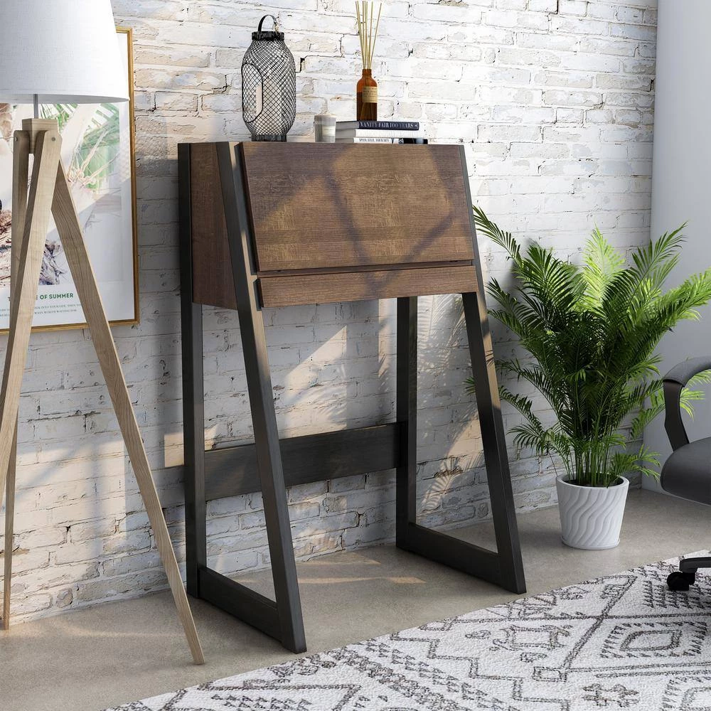 Turn the tables on conventional design with an enticing piece styled for maximum effect. The Claude Contemporary Storage Desk in Walnut Oak is a multi-functional piece that can double as a trendy bar or convenient workspace. The flip-down cabinet is paired with a slim drawer so clutter can be hidden away but easily accessed. The two-tone frame is a true show stopper with its distressed gray panels and angular black legs.
