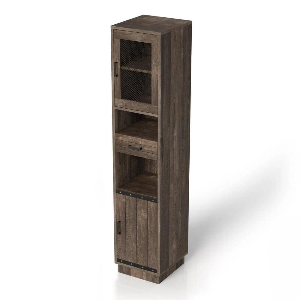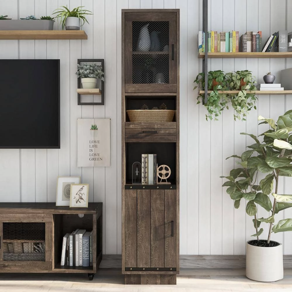 Charming plank style panels and corner brackets make the cooper reclaimed oak tv stand a stunning industrial piece. The multiple storage compartments are a great way to store all consoles, movies and more for a well organized tv room. Mesh inserts and handles complete the rustic design for a wonderfully functional stand with tons of character.