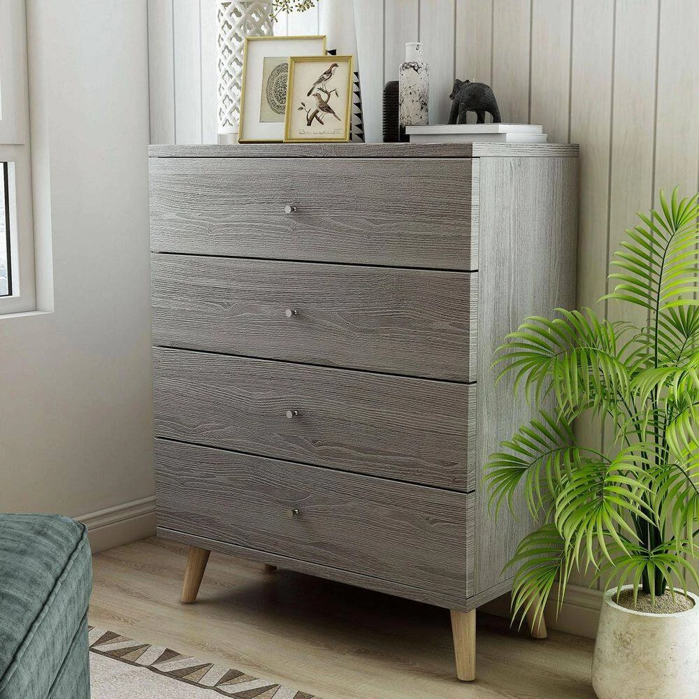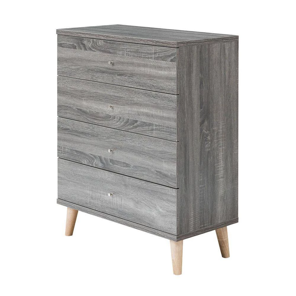 Modern and sleek, the Cordero 4-drawer chest is a subtle addition to any home. Features spacious drawers built on metal glides for smooth and easy access to your items. Minimalist knob pulls and natural tone tapered legs add a mid-century touch. Distressed gray finish is a nice neutral hue that pairs well with a variety of color scheme to pair well with existing furniture.