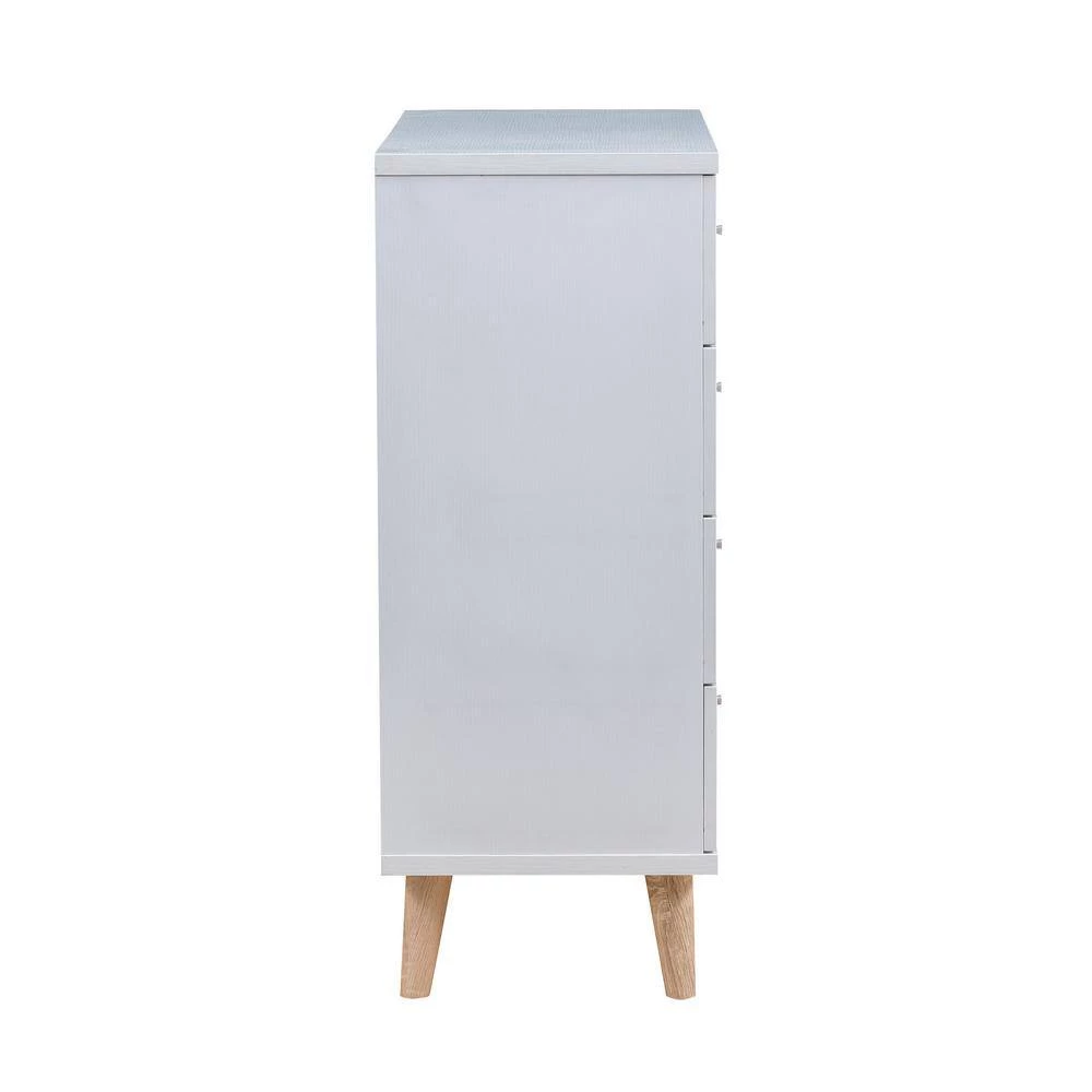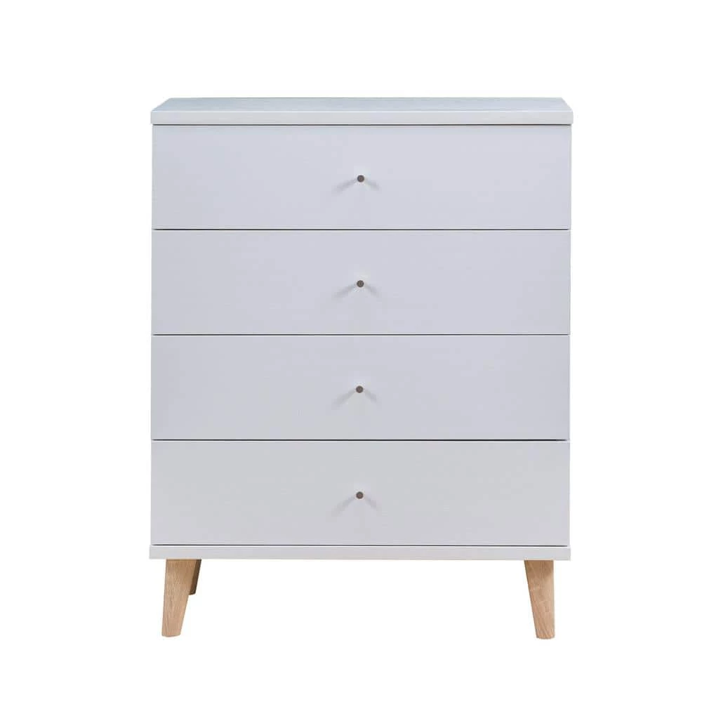 Modern and sleek, the Cordero four drawer chest is a subtle addition to any home. Features spacious drawers built on metal glides for smooth and easy access to your items. Minimalist knob pulls and natural tone tapered legs add a mid-century touch. Distressed gray finish is a nice neutral hue that pairs well with a variety of color scheme to pair well with existing furniture.