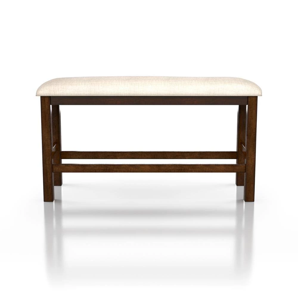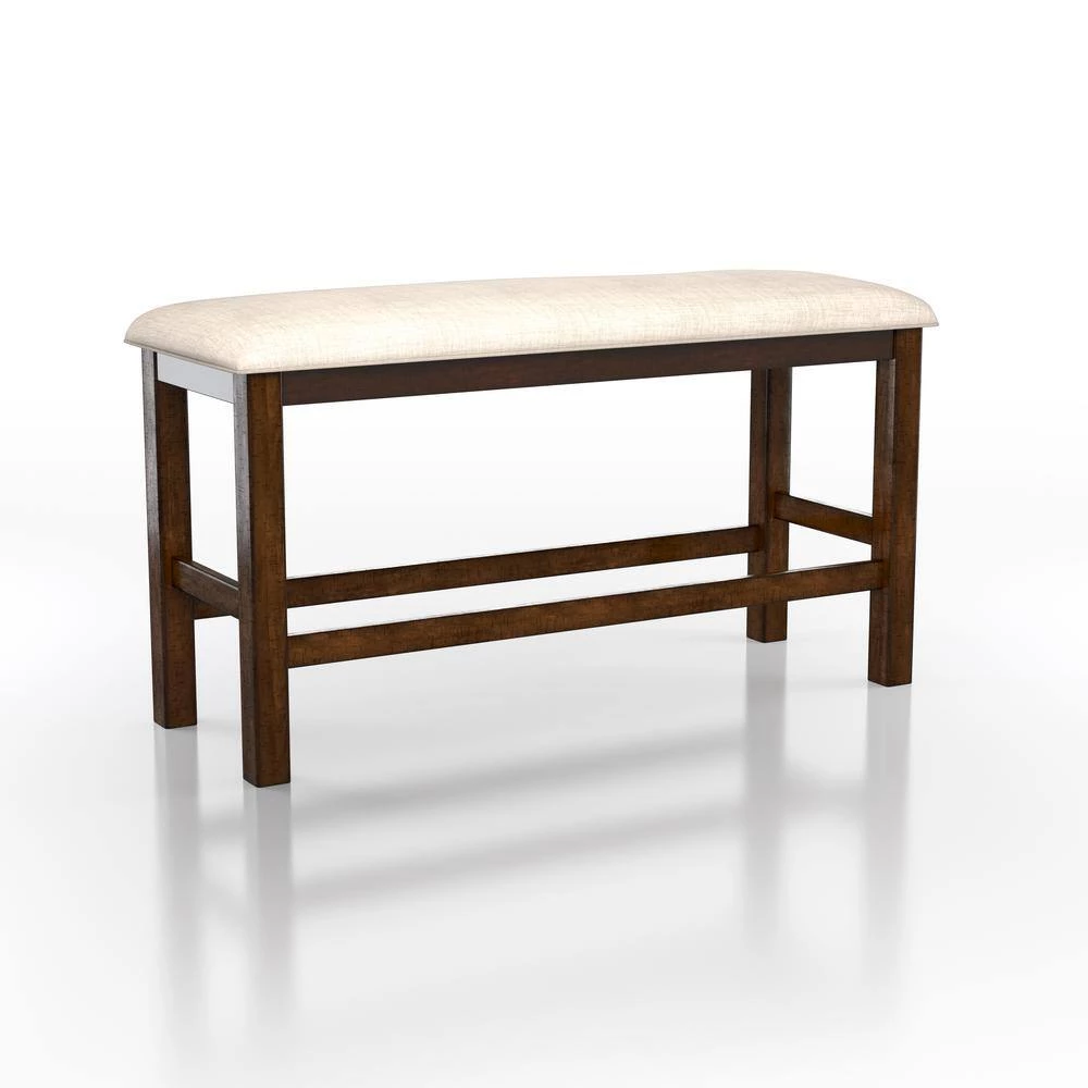 Whether your dining space is country farmhouse or rustic, this counter height bench is bound to blend with your decor while providing plenty of function. A classic silhouette ensures style in your dining space and support as you dine. Coming in a rustic oak finish while adding an element of warmth, this bench comes equipped with padded upholstery in beige for a coordinating color palette. This frame is made from recycled lumber, which had its beggings on a rubber tree farm. To prevent the traditional waste of natural resources through burning, rubber trees are retired into furniture.