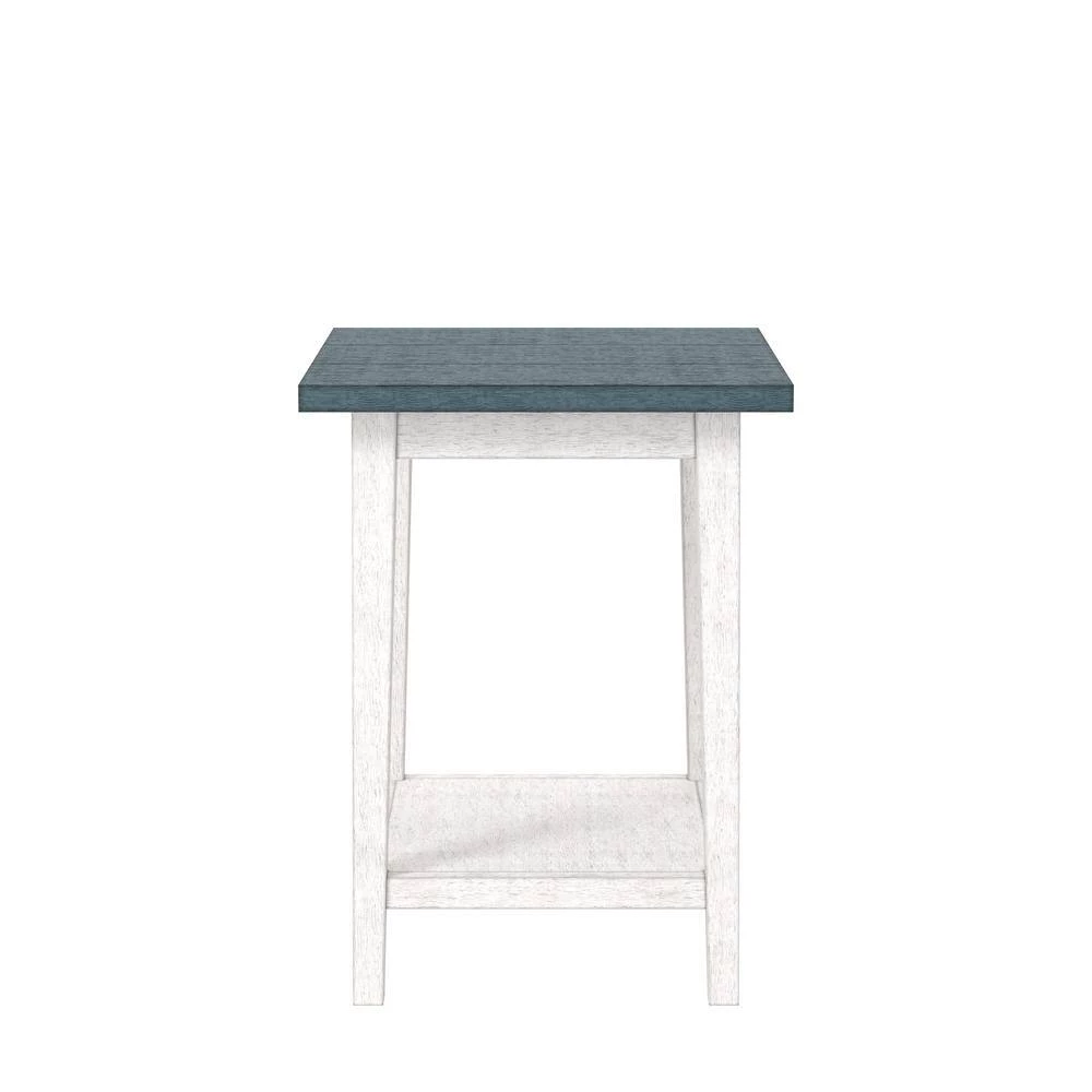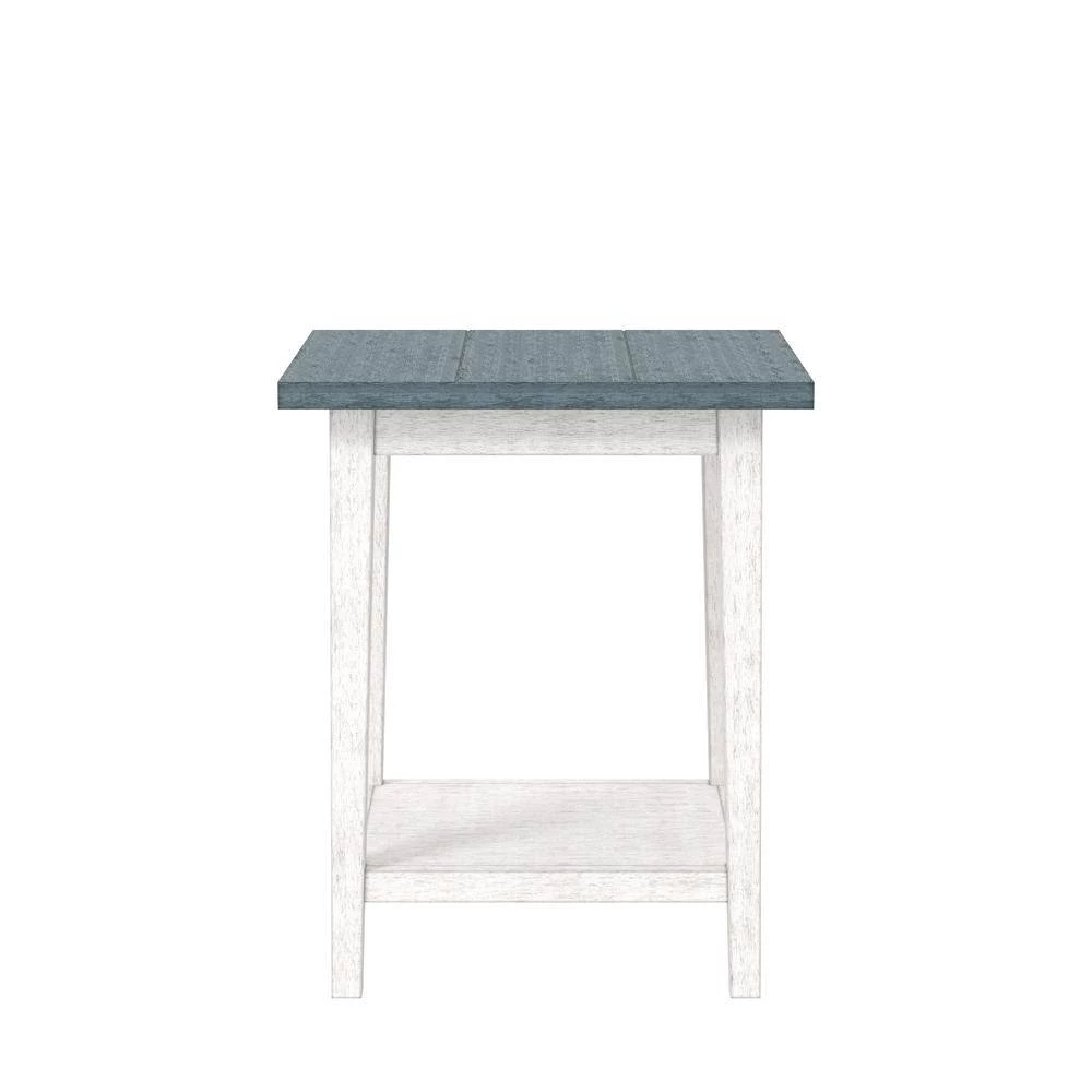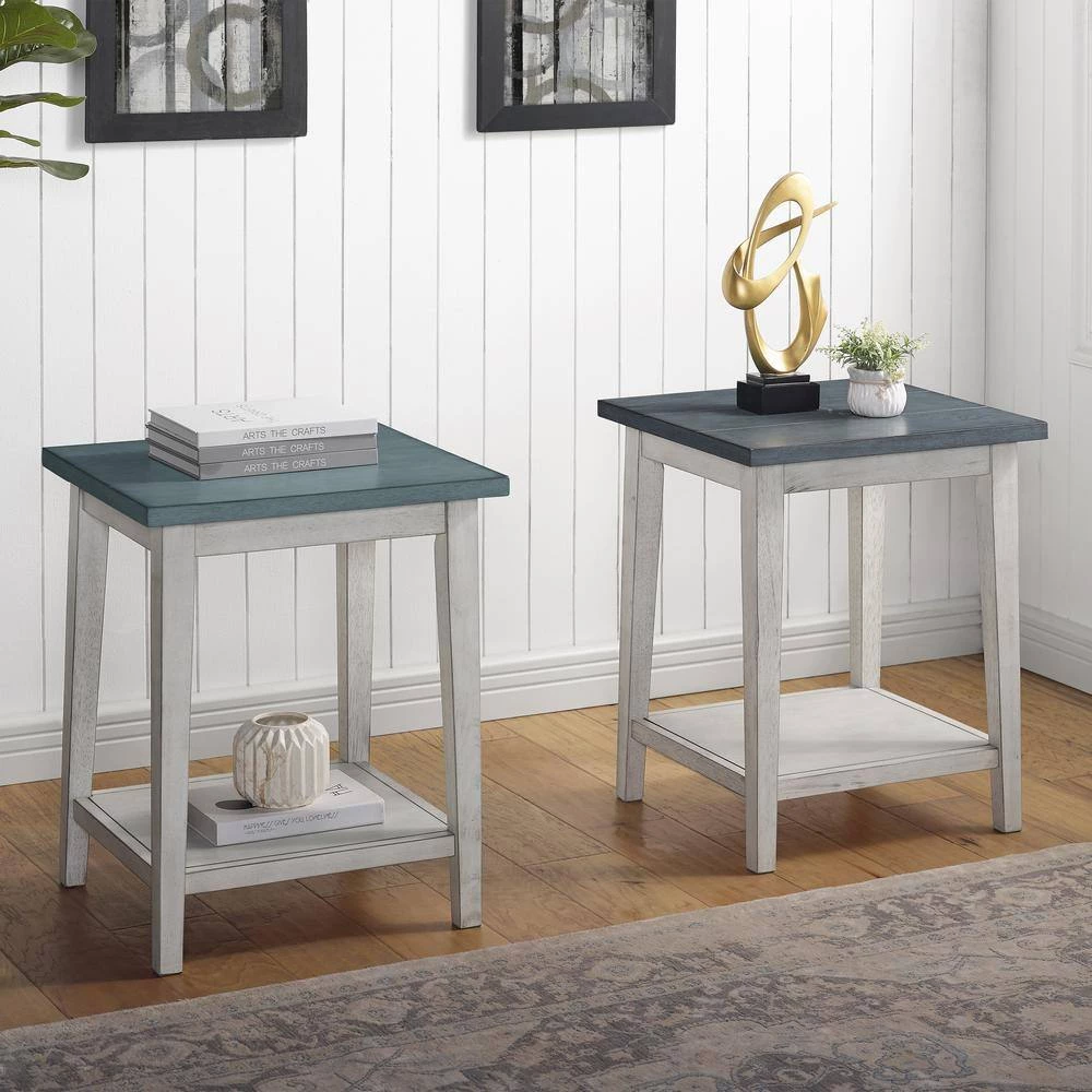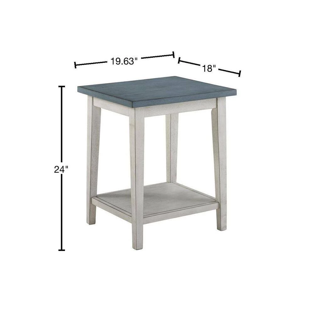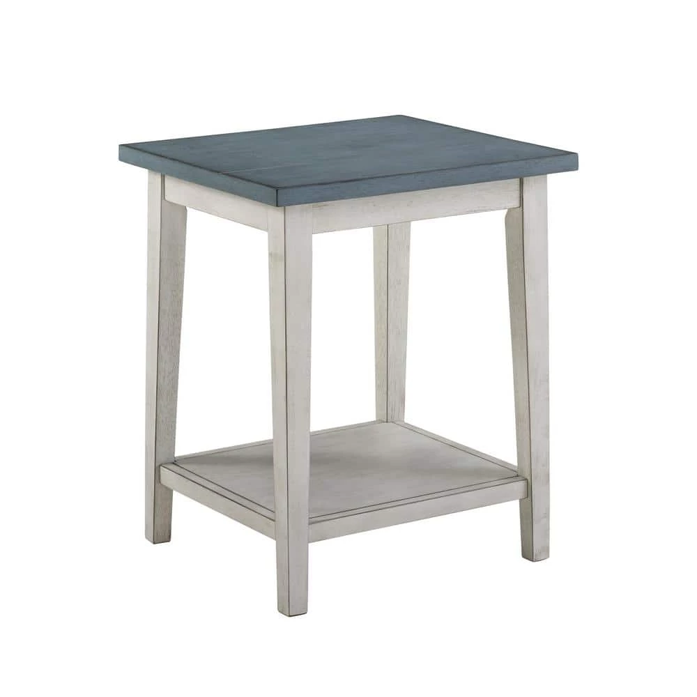 A cool, contrasting tabletop delivers on a relaxed, two-tone look that enlivens this mid-century modern side table. Perfect for the living room to provide space for a tabletop lamp or vase of flowers, this end table boasts a plank-style tabletop in a choice of finish options, resting on an antique white finish base with lightly tapering legs. One lower shelf creates space for coffee table books or a selection of decor.