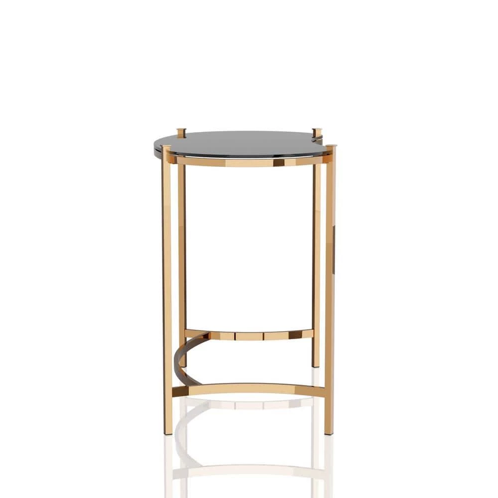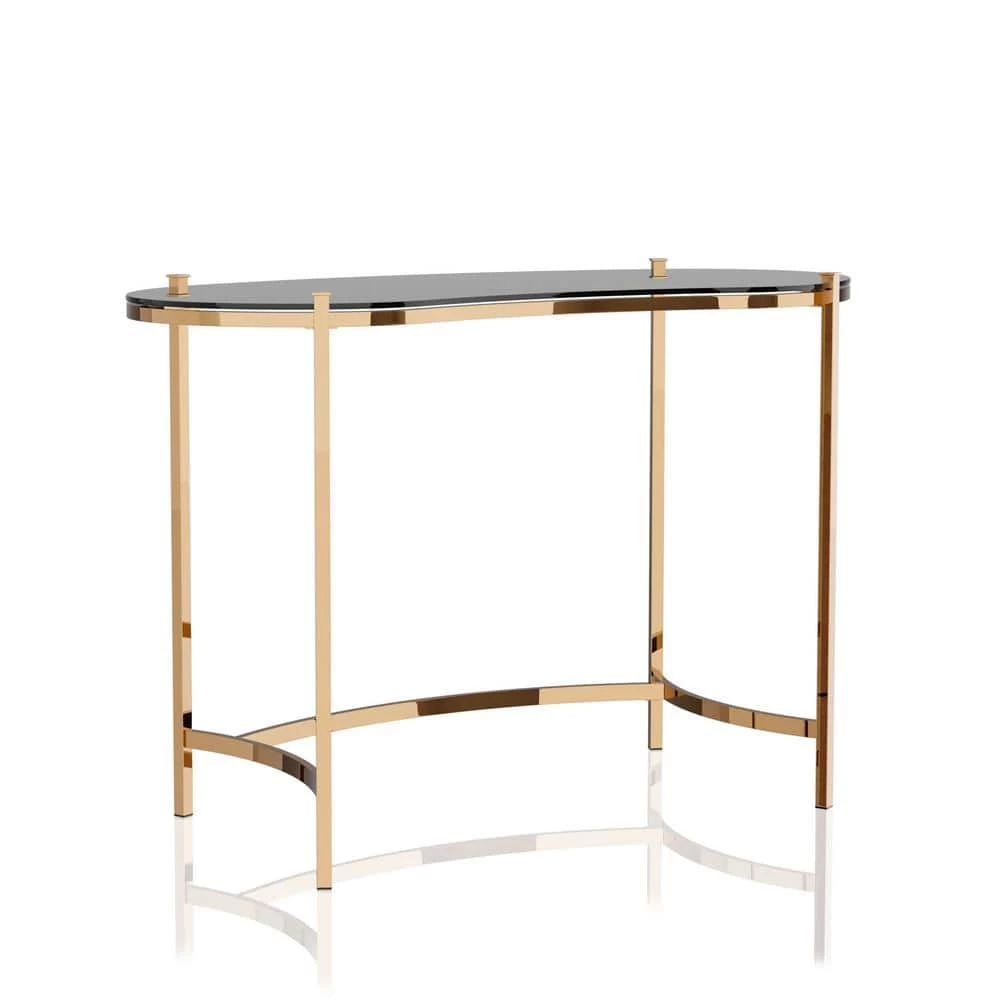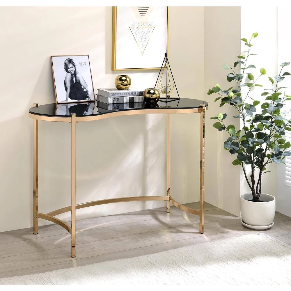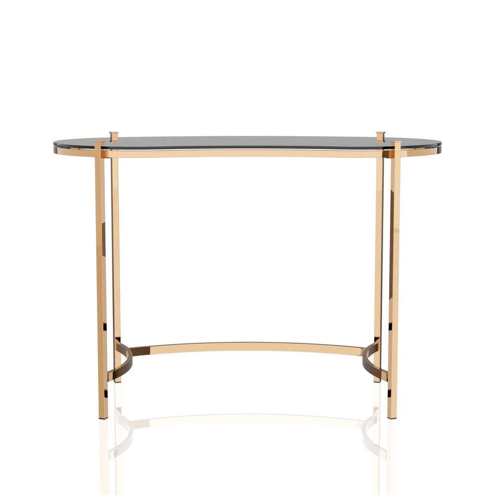 This stunning contemporary console table radiates radiant sophistication with its mix of glass and steel to transform any modern living space. The steel frame is crafted with a lustrous gold coated finish, while the tabletop features tempered glass for added elegance. The rounded edges, curved support beams, and sleek legs add a dynamic dimension to the overall design of this immaculate console table.