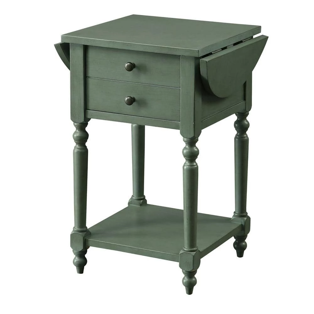 This side table adds antique style charm to your home. The side table offers a unique space to store items and showcase decor. The oval tabletop features a wood drop leaf on each side that lets you expand and minimize the size of the table. Two drawers are contrasted by beautiful round pulls and the open shelf is framed by elegant turned legs. Featuring birch veneer over MDF, this Side Table helps you create a lovely eclectic style.