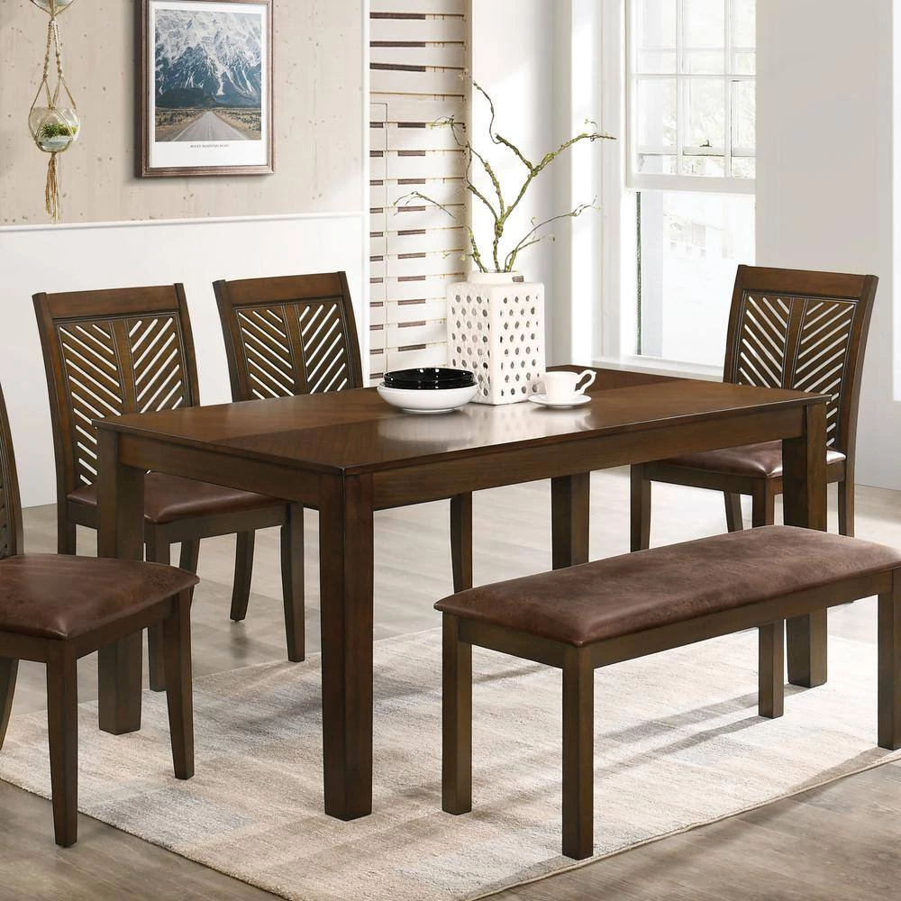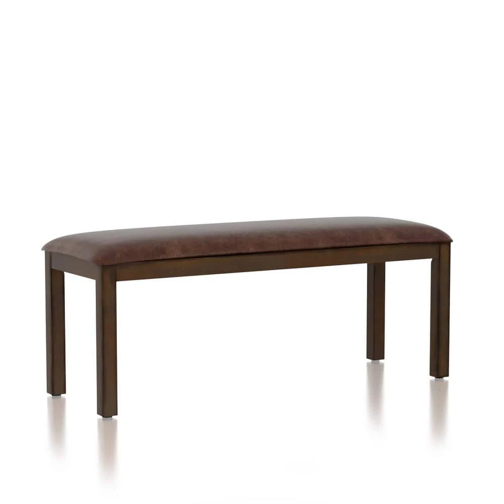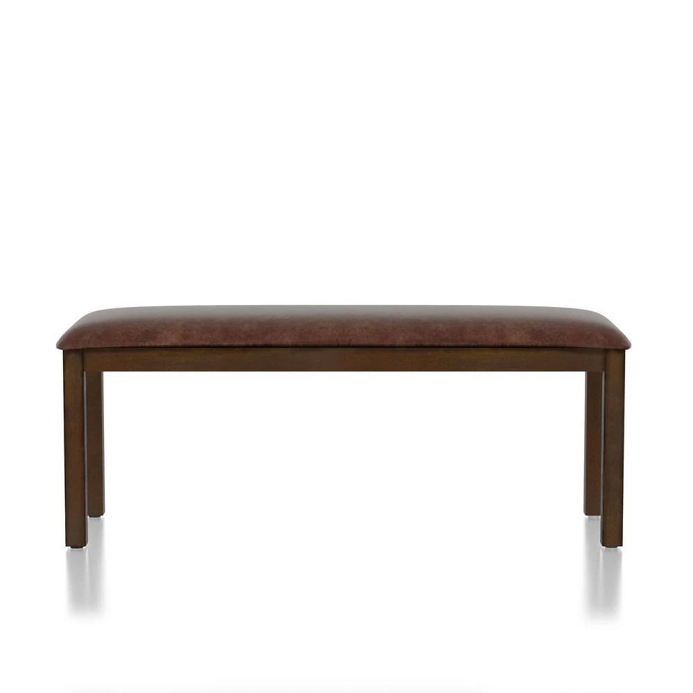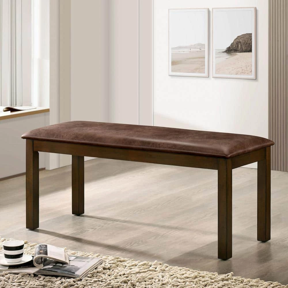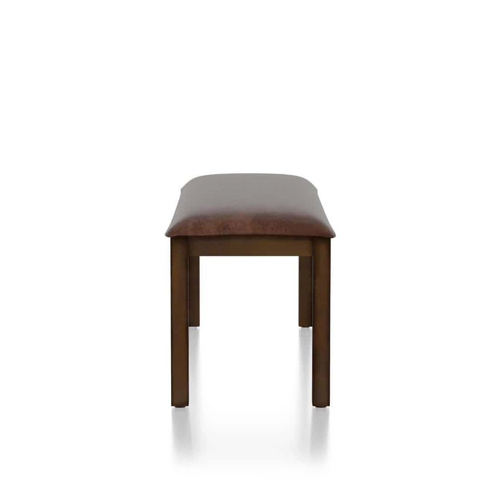 Take your stylish home decor to new heights with this transitional dining bench. Beautiful in a rich walnut wood finish, the bench is a fun, casual way to augment your stylish dining table or eat-in kitchen. The long bench is equipped with a padded, faux leather seat paired with square post legs that stand the test of time.