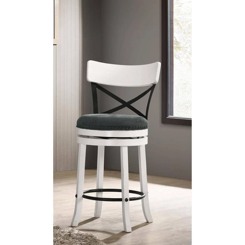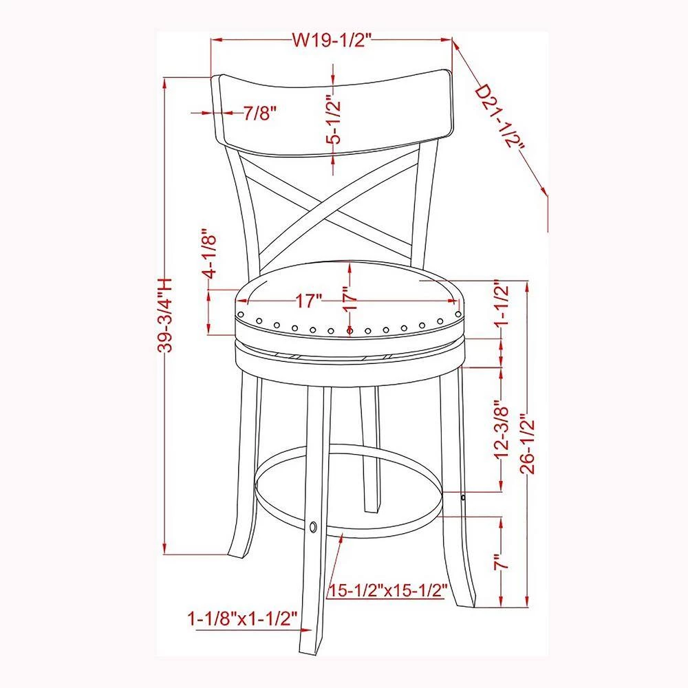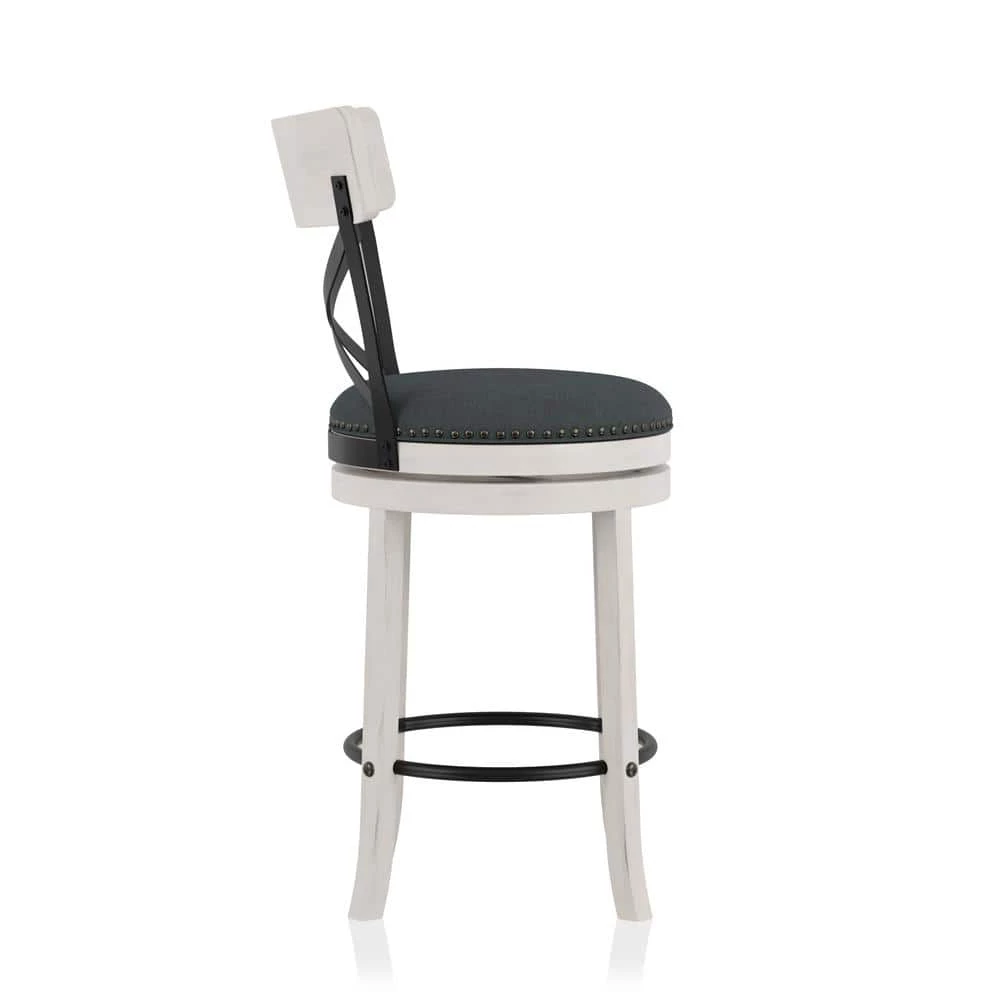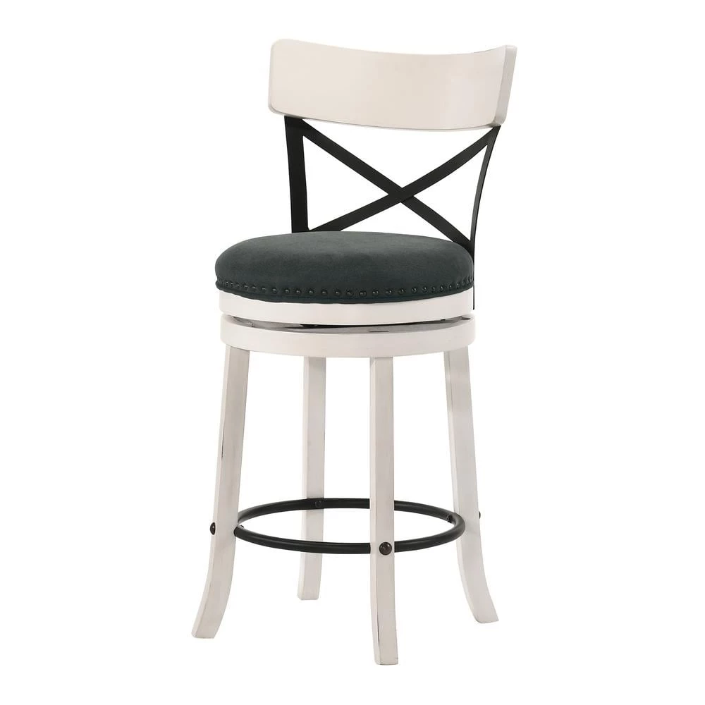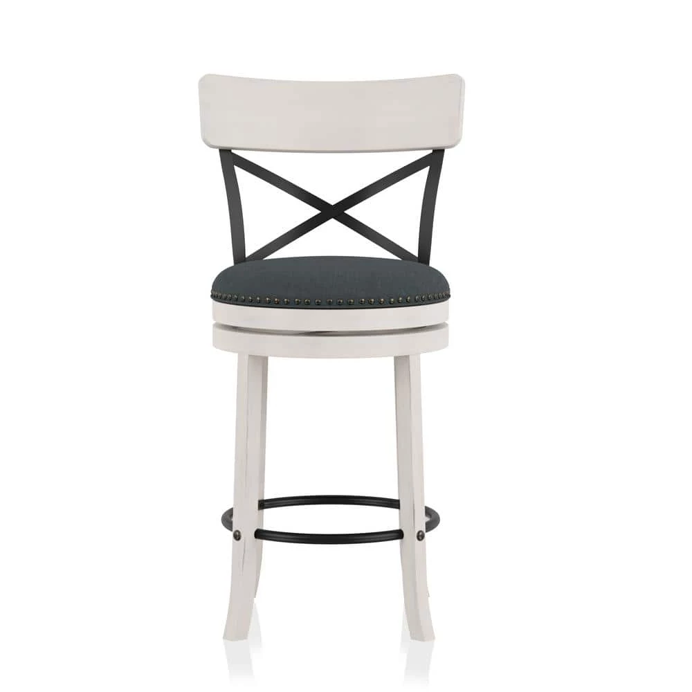 This set of bar chairs is the modern farmhouse style you’ve been looking for. The X-shaped back is a country comfort with a curved back made from bend wood. Its round fabric seat is adorned with nailhead trim and serves a functional swivel design. A footrest completes the chair for triple-action support.