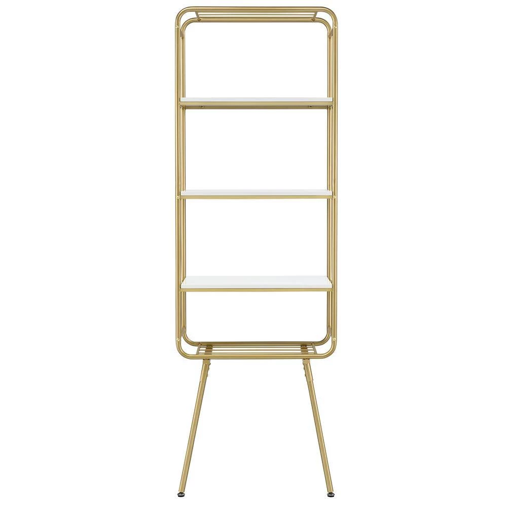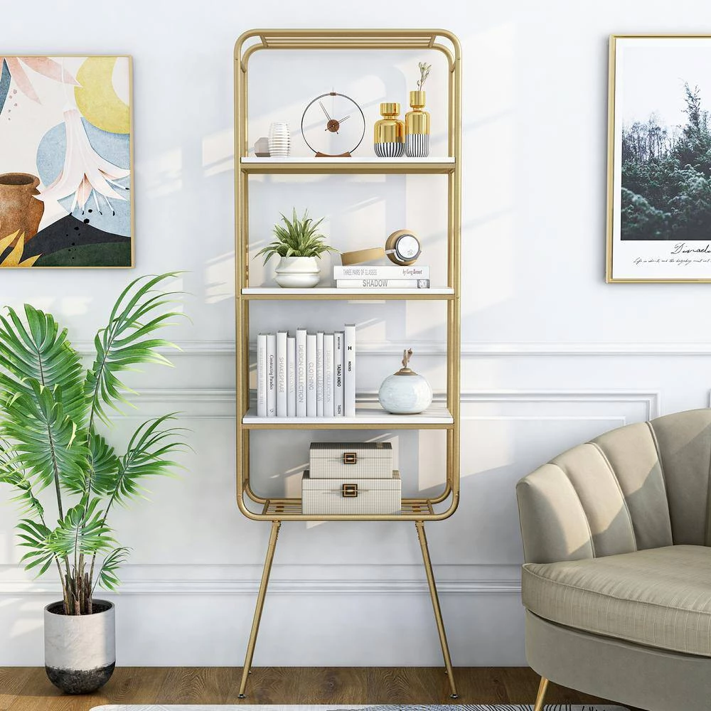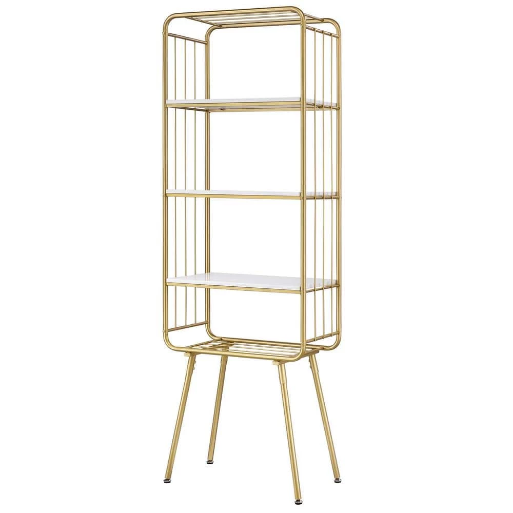 Whether you’re aiming for a glam home office or a retro living space, this etagere passes the vibe check. A gold frame on flared legs is a mid-century modern touch with chic high gloss white shelves. Display books, decor, or treat it as a mini bar.