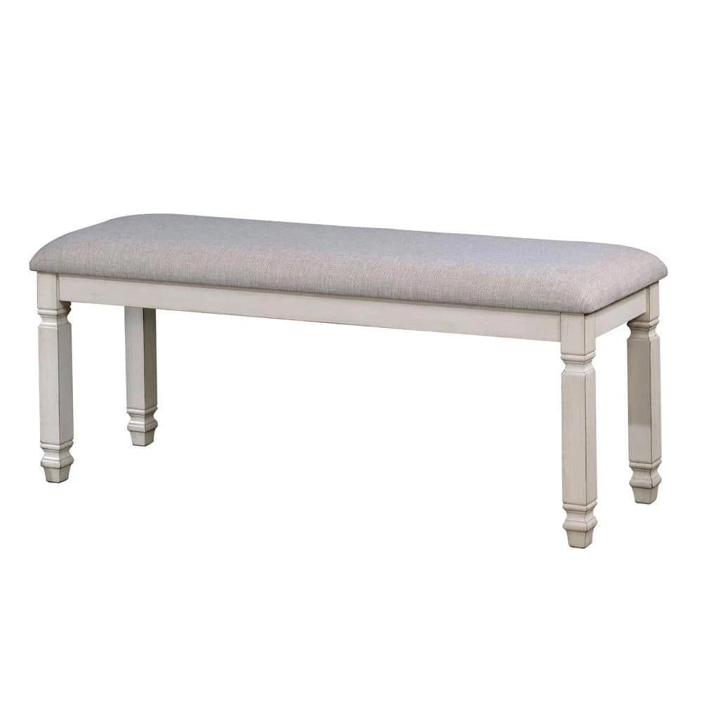 Expand the look of your dining table with the Ely Wood Bench by Furniture of America. The elegant leg structure adorns the spacious cushioned fabric seat, delivering a simple yet elegant touch to your dining room. In addition, the antique white wood finish lends a country charm that complements many color palettes and decor styles.