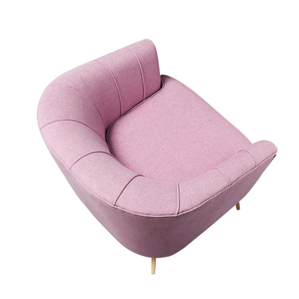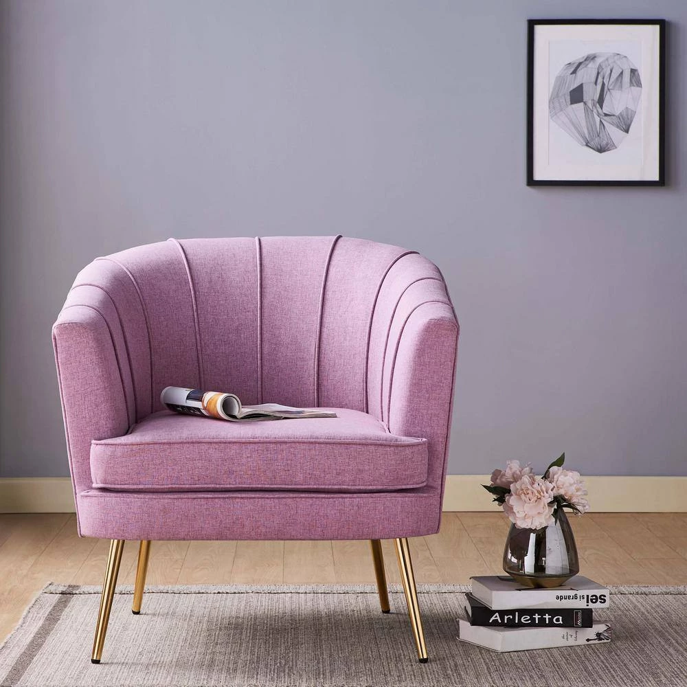 Though the contemporary accent chair is styled with slender gold legs, it’s solid wood frame is able to withstand up to 300 Lbs. Foam is layered over pocket coils for a firm seat. Vertically welted sheltered armrests create a shell design for that maritime tranquility. The accent chair comes in different colors and upholsteries: magenta, peach, soft pink or aqua grey velvet, tulip pink fabric or lime green Faux Leather.