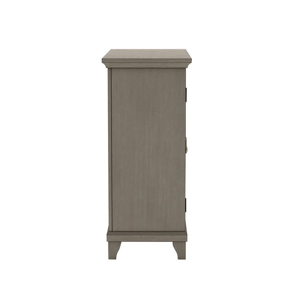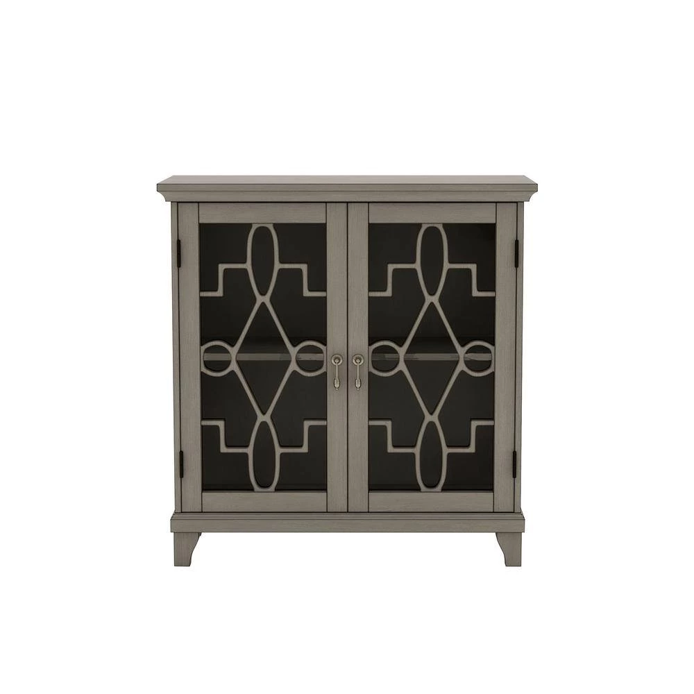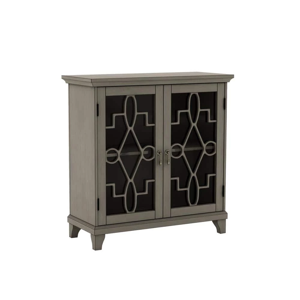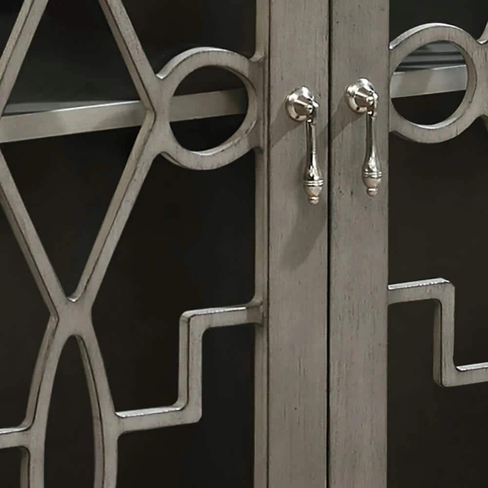Update the vibrancy of your living room, den or even bedroom with transitional hallway cabinet. This versatile cabinet is crafted of MDF, engineered wood and poplar wood in a cool gray finish highlighted by subtle distressed accents. 2-glass cabinet doors with a stylish inlay motif featuring geometric shapes open up to 2-concealed shelves for a cabinet that’s as functional as it is stylish.