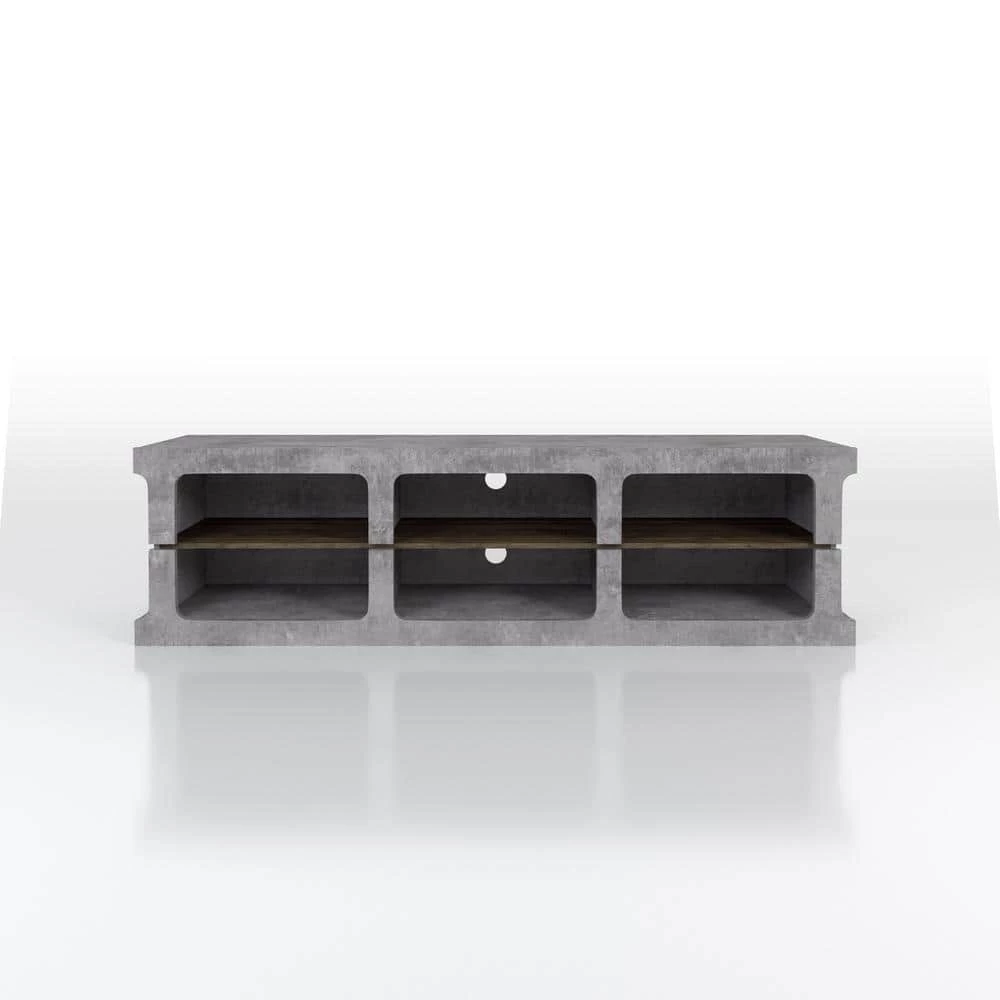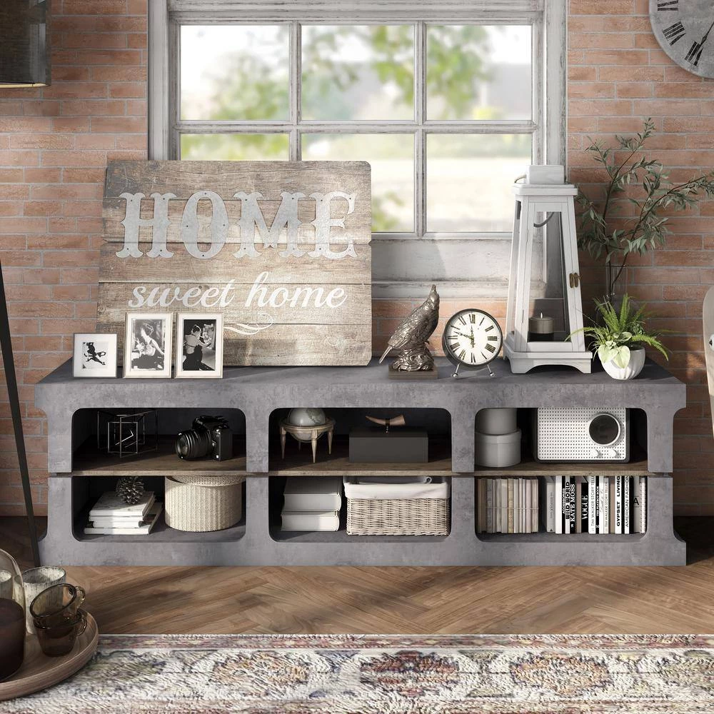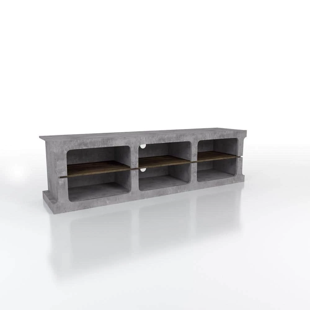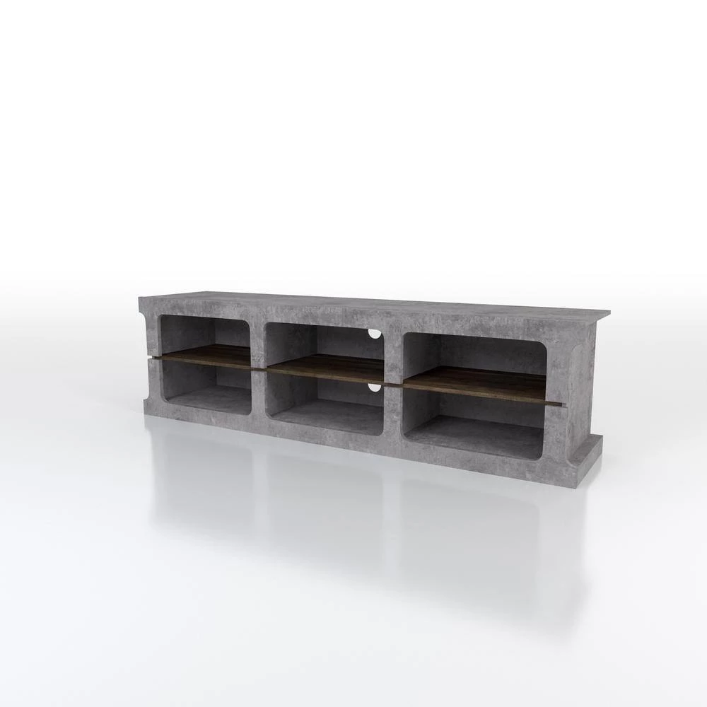 A contrasting wood finish shelf bisects the symmetrical, gray cement finish halves of this industrial TV stand with open shelving. Perfect for your rustic, casual, or farmhouse living room, the console boasts a low profile and six shelves for storage and display. This media console is the perfect choice beneath a wall mounted television, adding a place for media and gaming components.