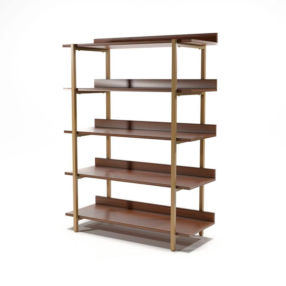 Open and eye-catching, this contemporary light walnut wood five-tier bookcase doubles as a room divider to define an open concept living space. It’s a bold design that combines a rich gold finish frame with colored shelves. Shelves are stacked one on top of another to create a vertical display space with an open back, adding exquisite versatility. Add baskets for storage or create a lovely display of personal treasures.