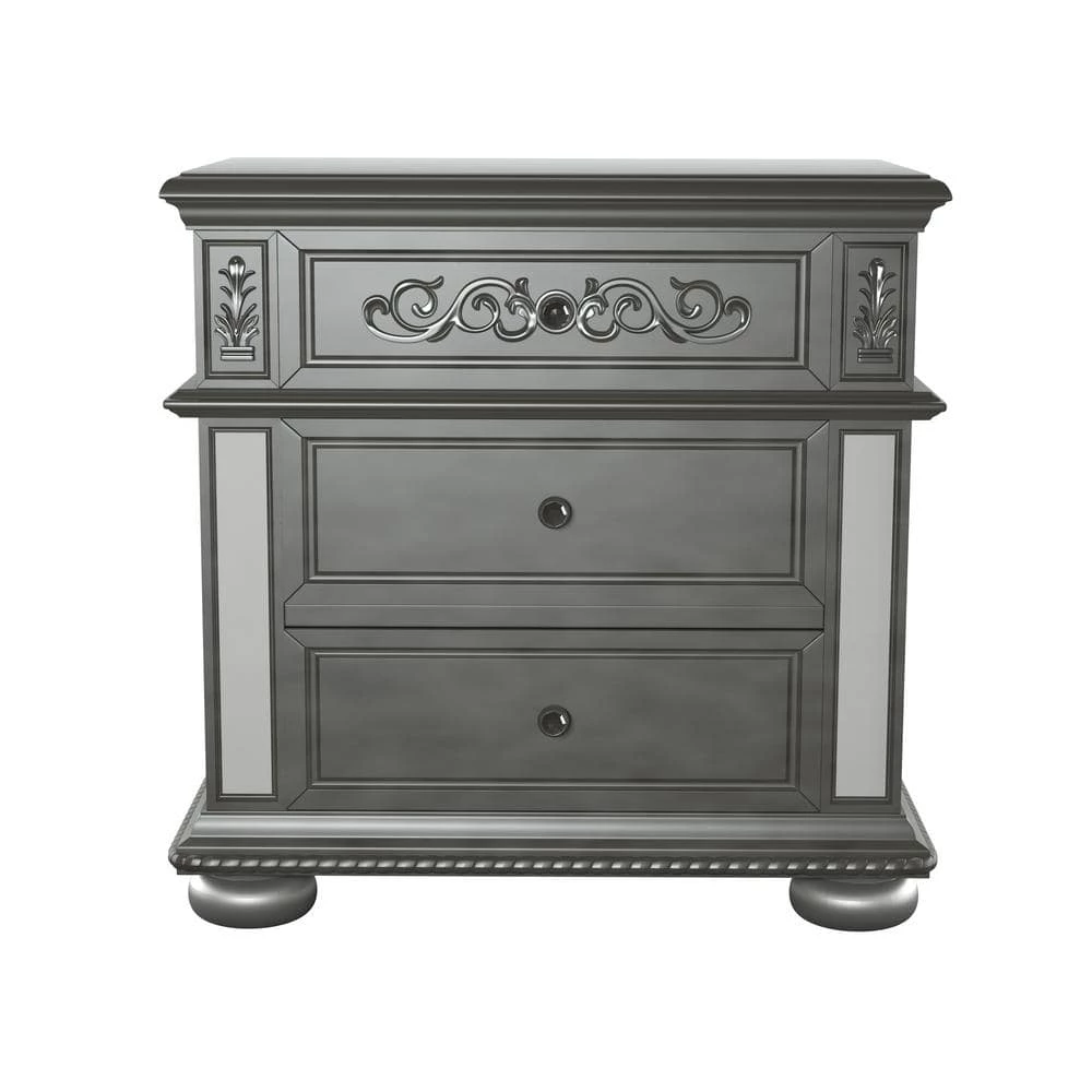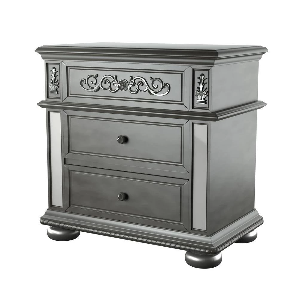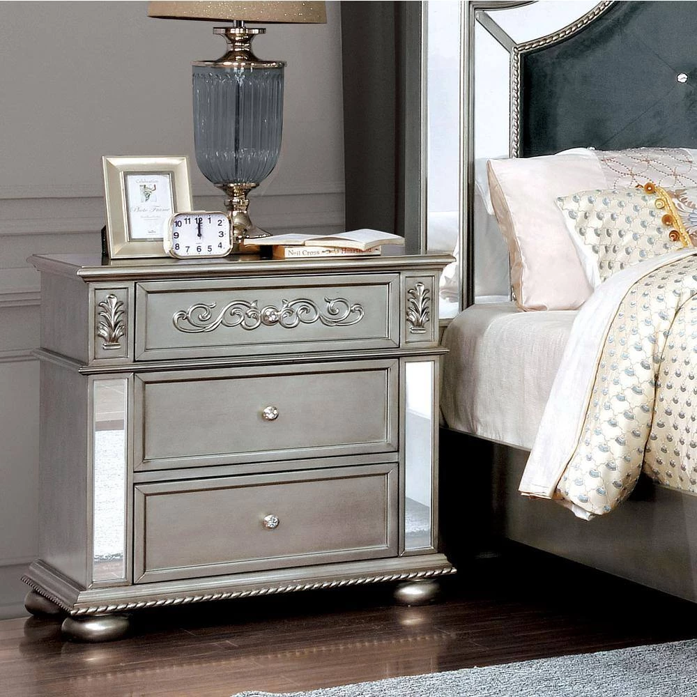 This glam look 3-drawer nightstand brings you the fantasy of living in luxury life in accent Rome. The mirror accents and silver finish brighten up the whole room, while the floral wooden accents add an elegant layer to it. Even the small drawer knobs look stunning with the diamond like inserts.