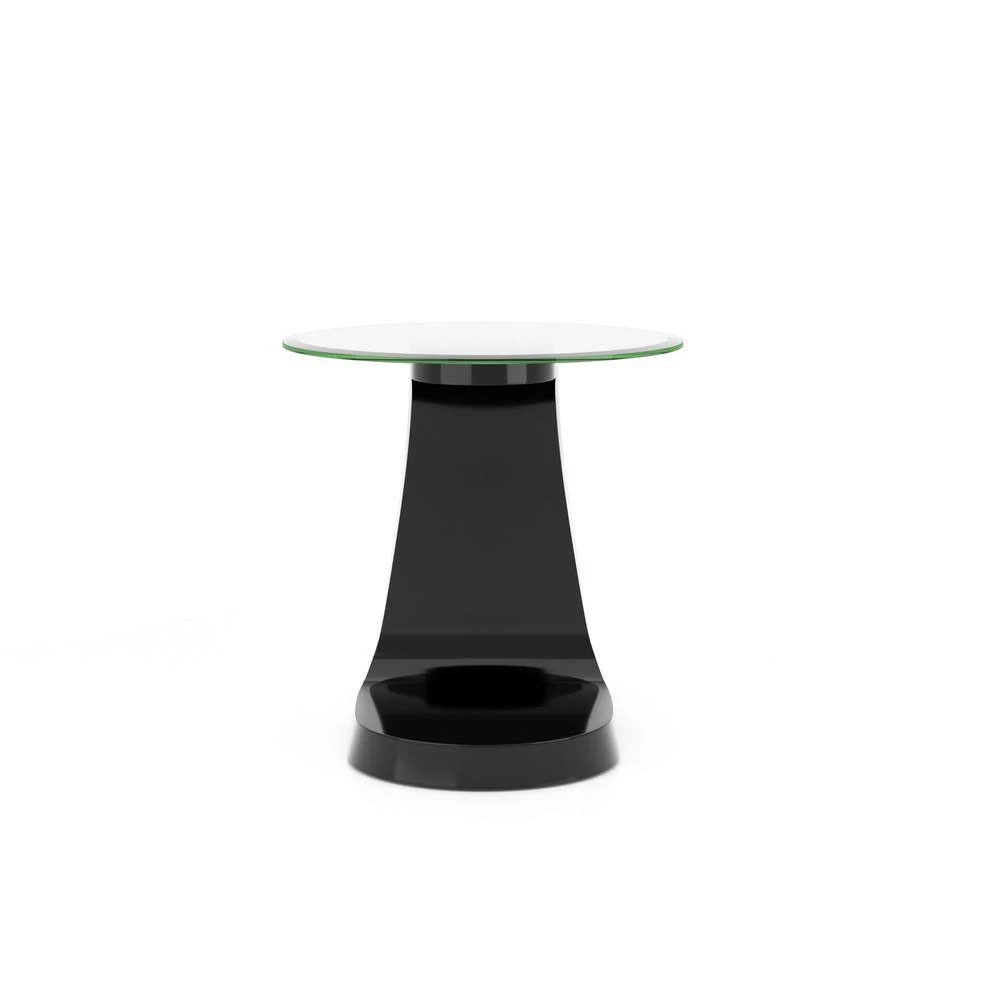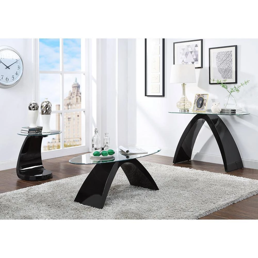 An arched, cantilever style base lends a modern touch to this elegant end table, perfect for adding a resting place for drinks and reading material next to a side chair or flanking each end of a sofa. This end table features a striking abstract shaped base with a lustrous high-gloss finish, making it easy to maintain and offering a handsome look for a transitional style home. In addition, this end table offers a tempered glass tabletop with a classic beveled edge that lends a softness to the piece.