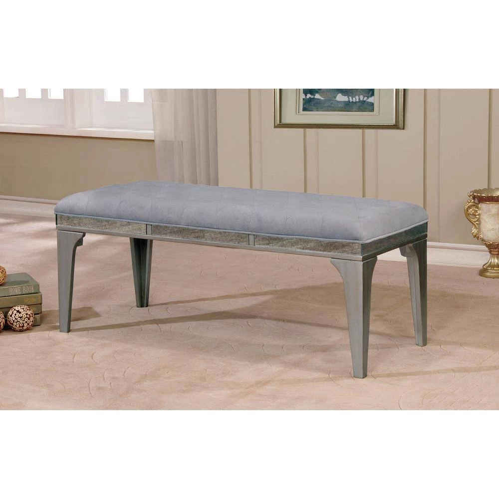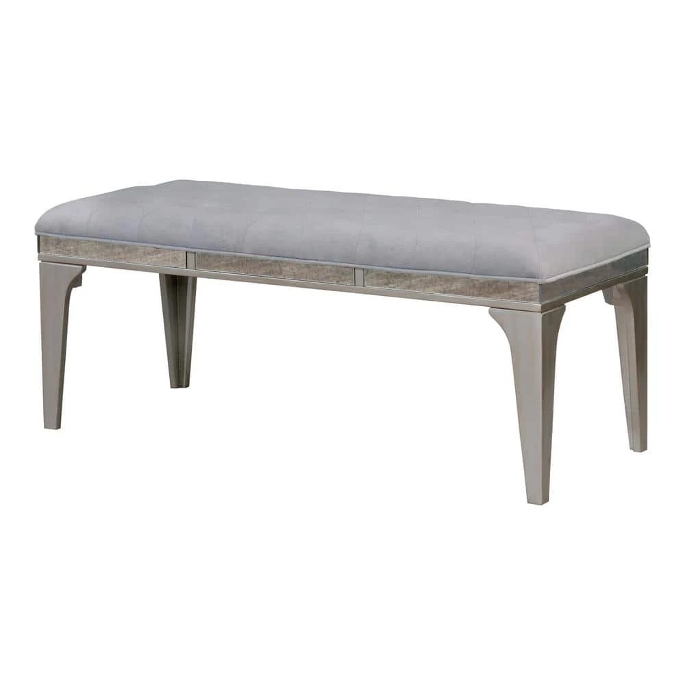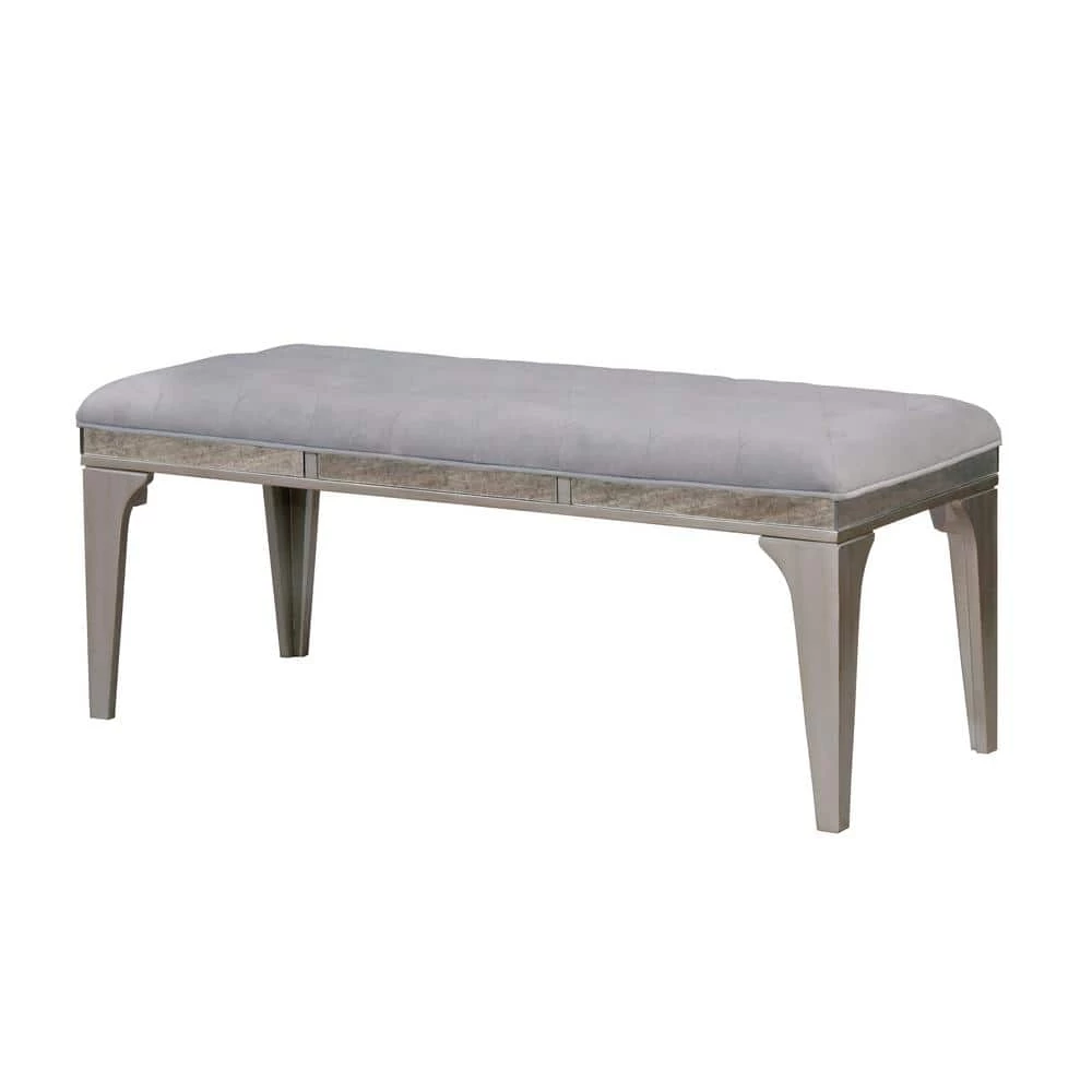 The rectangular structure of this contemporary style dining bench showcases light grey flannelette upholstery with complimenting mirror inserts. For even more glam, this piece highlights its tufted design with crystal-like acrylic buttons and matching silver finished legs. Matching dining chairs sold separately.