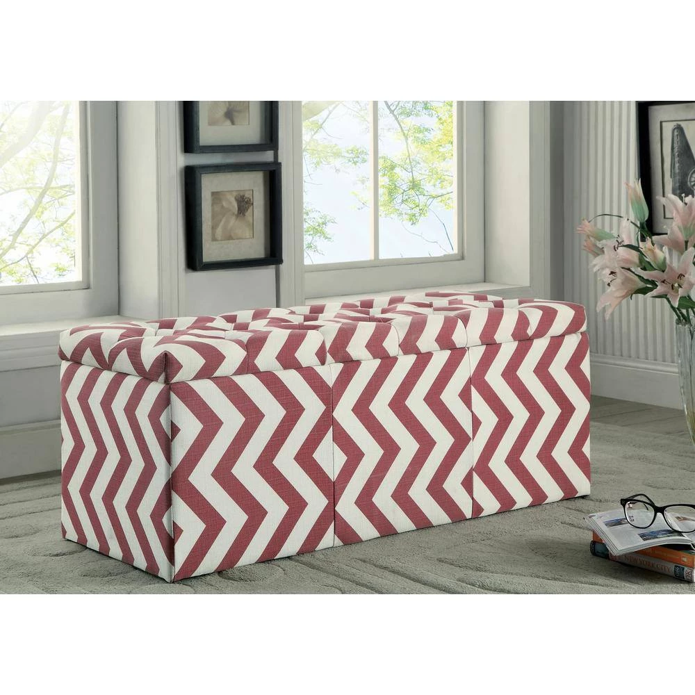 Energize a modern living room or bedroom with this upholstered storage bench. Built from solid wood and veneer, its red and white zig-zag fabric upholstery is engaging. Stitched detailing and a button tufted top bring just the right of contemporary elegance for your home.