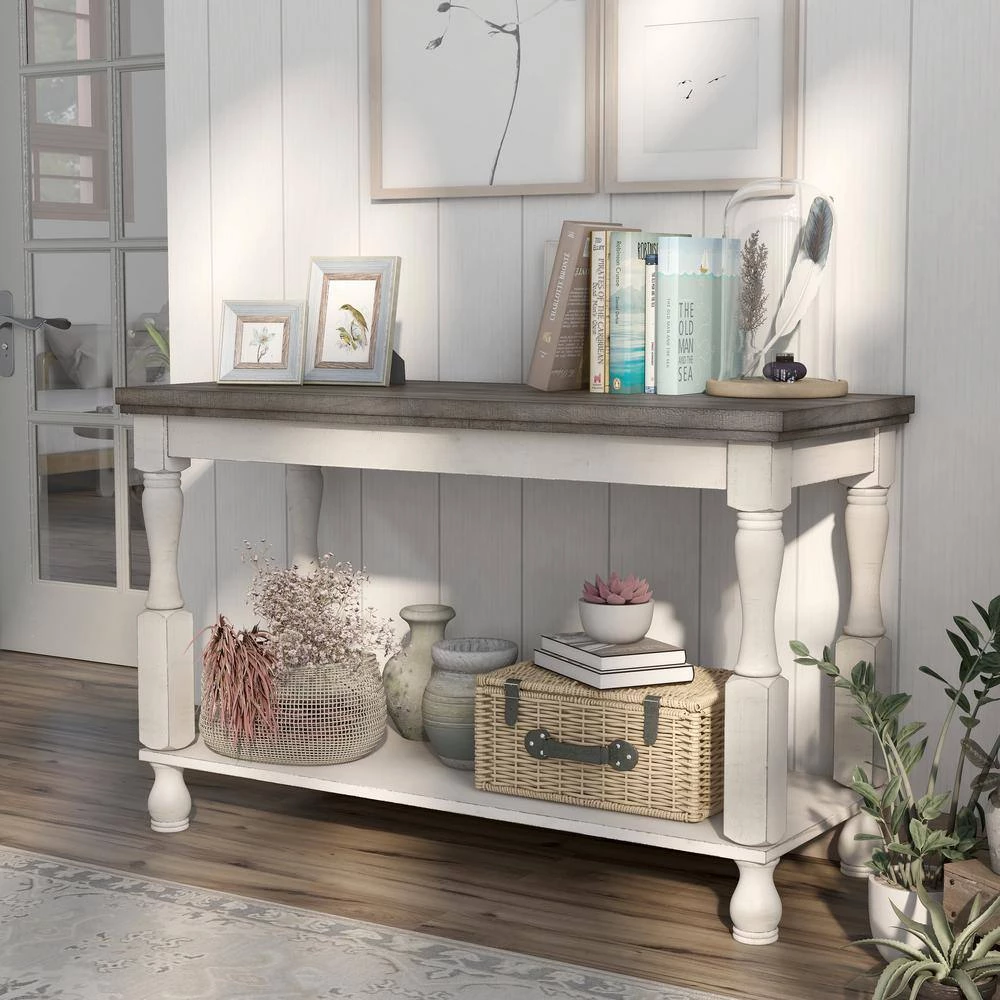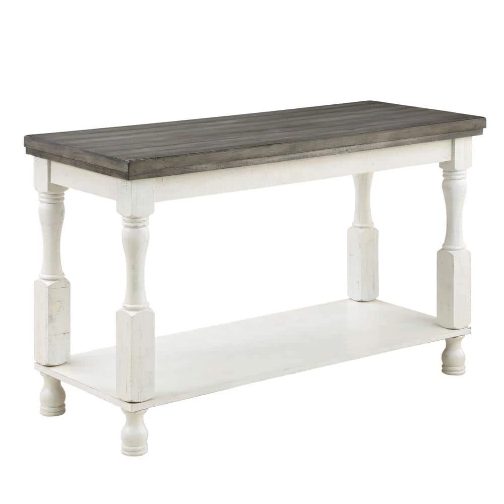 Sink into the rustic, modern farmhouse ambiance of this charming wooden console table. It pairs a soft gray wood grain finish tabletop with an antique white finish base that adds traditional turned legs and a full lower shelf for added storage and display. Table legs are crafted from pine wood with manufactured wood surfaces are extra durable and resistant to damage for lasting enjoyment.