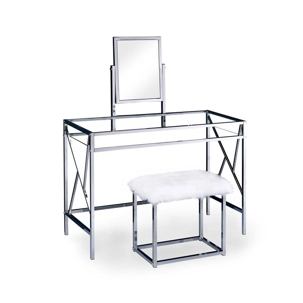Adding glamorous accent to your bedroom thanks to this makeup vanity set. Features in chic metal framework with durable tempered glass inserts while matching stool with fur-like upholstery details elevate the modernized home style. It also features an adjustable mirror that attached on the vanity top provide convenience that you can admire your looking and make yourself ready before heading out for a date. Crafted from durable metal and glass. Easy assembly required with hardware, instruction sheet included. Available in two finishes, sold separately.
